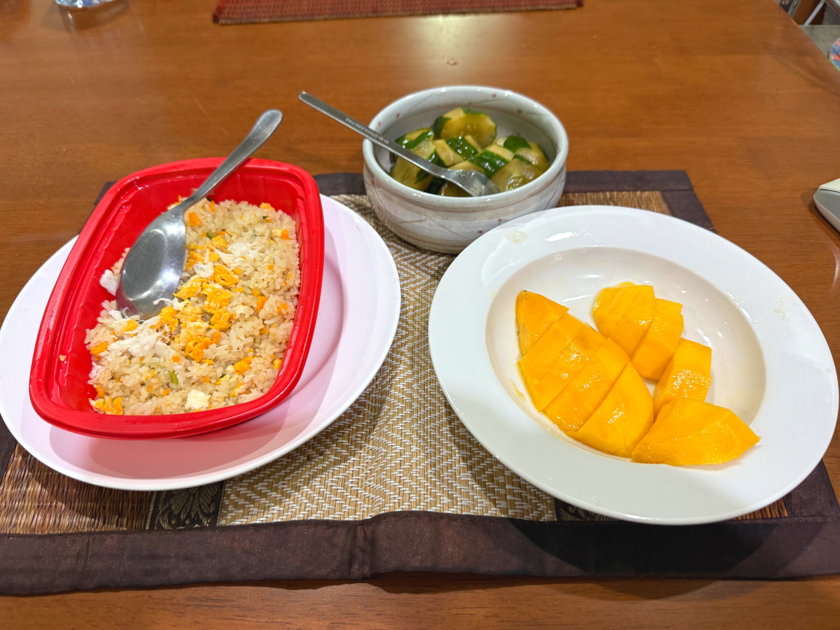 夕飯はコンビニ炒飯とドリアンにきゅうりの醤油づけ