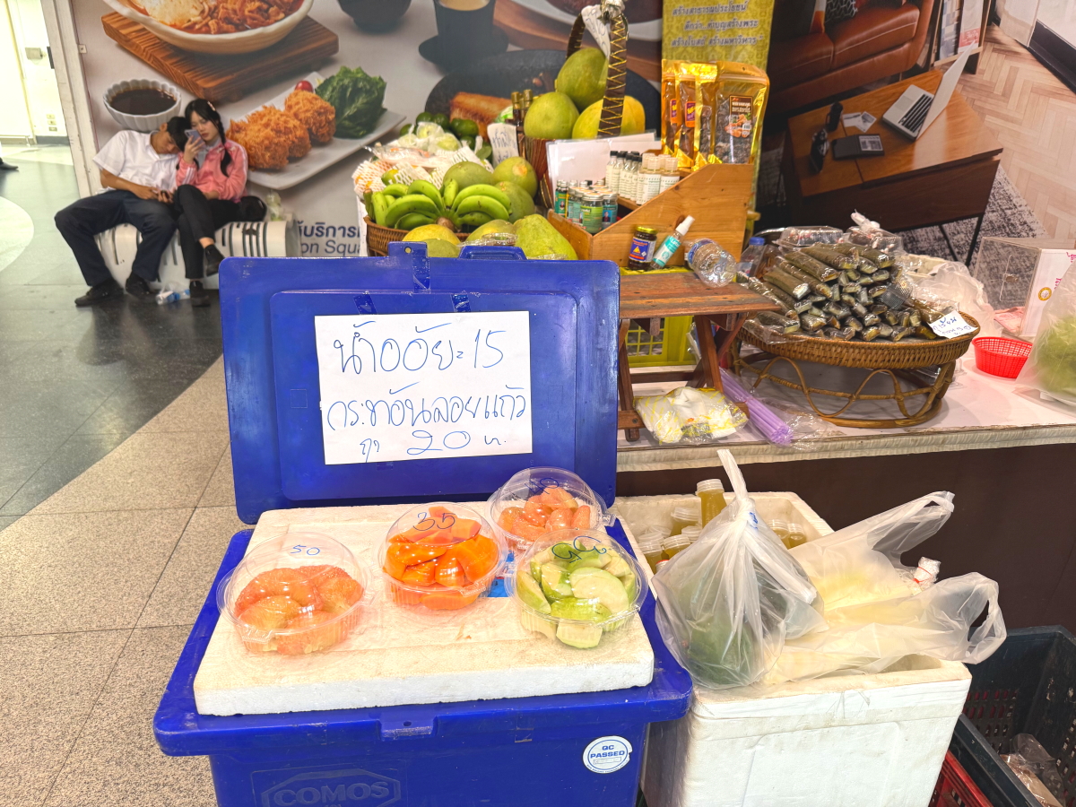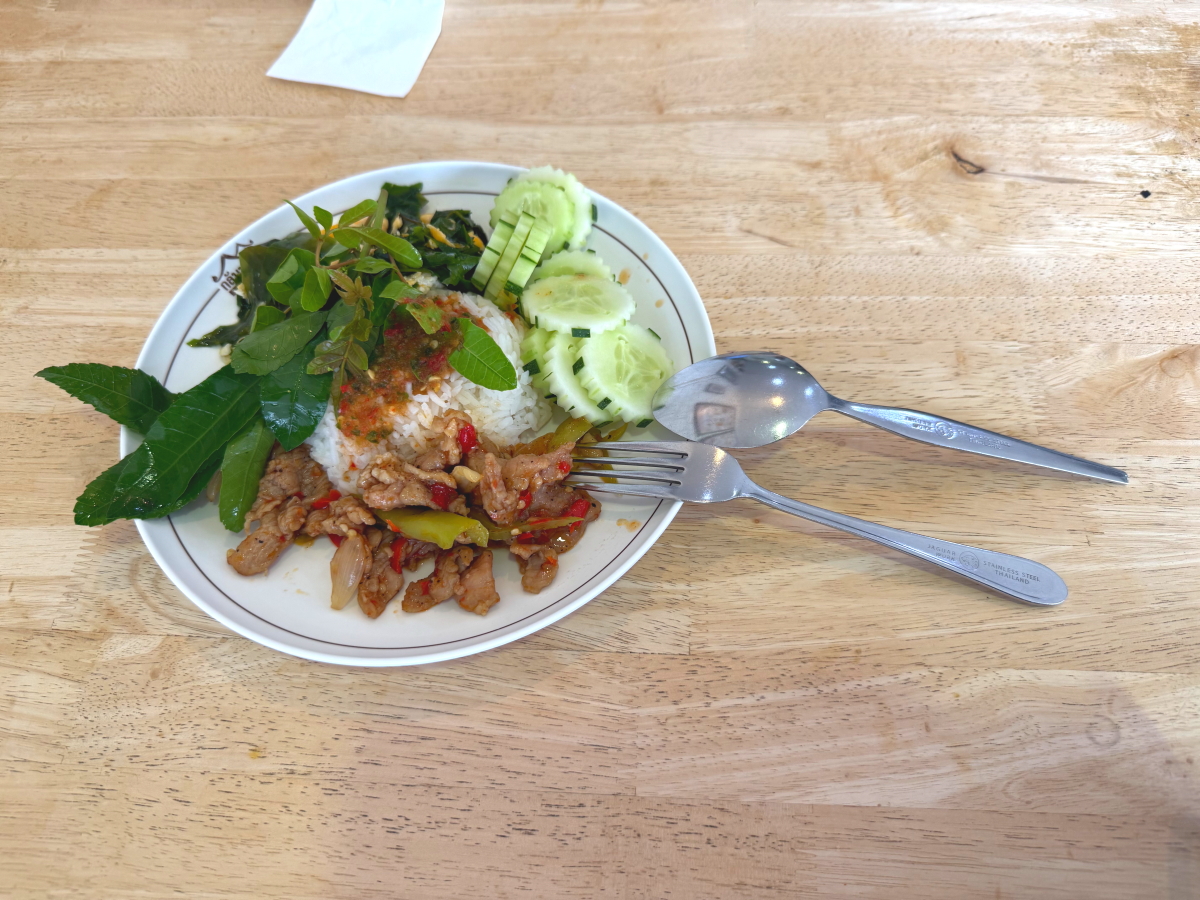 トッピングのきゅうりと葉っぱを盛り付けて、60バーツ ≒ 240円
