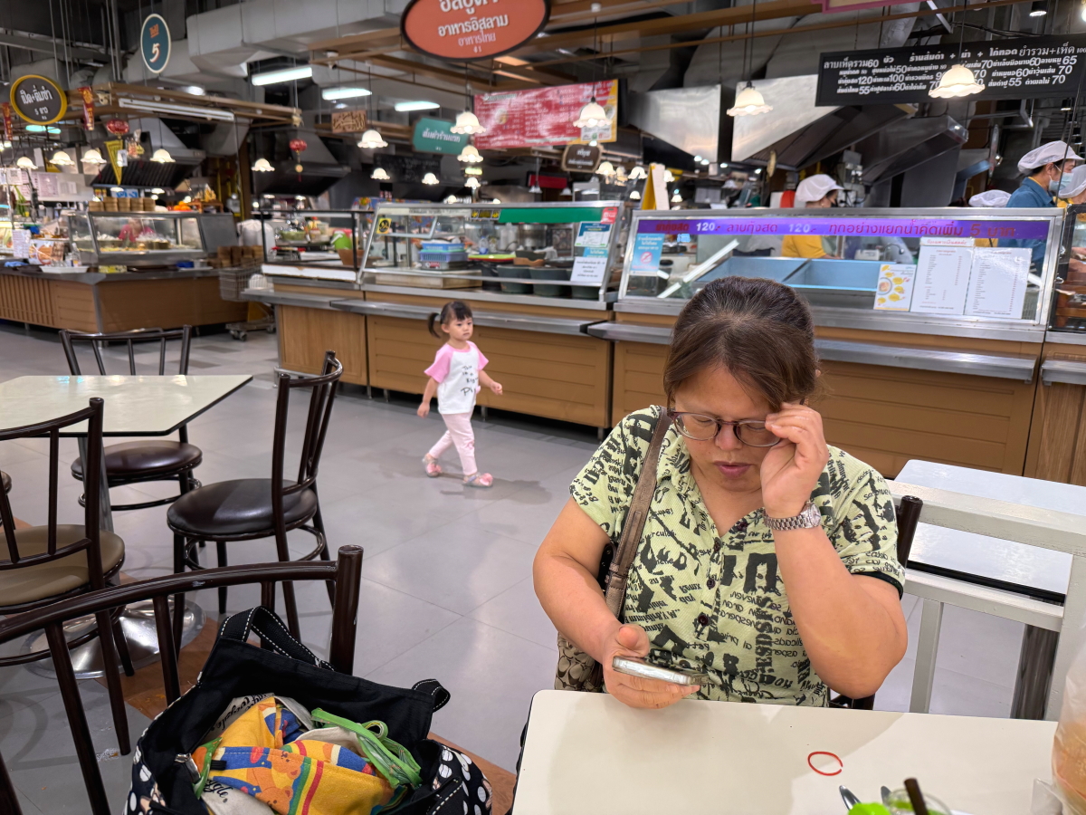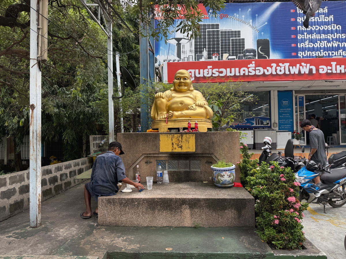 14日、街の電気屋さん、仏壇の他に福神様、横で食事するおじさん