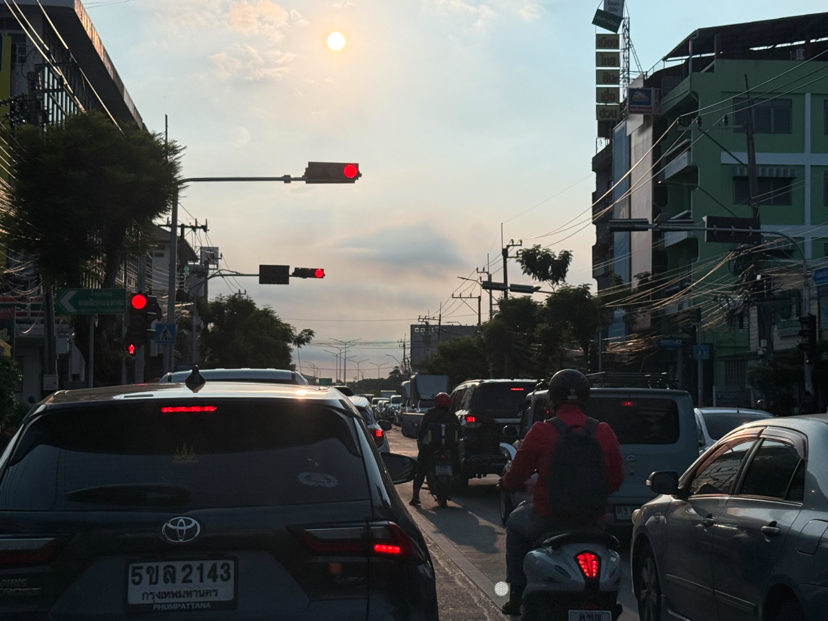 西の空に傾いたお日様バックに赤信号のカウントダウン、デジタル表示の数字はシャッタースピードの影響でスルー