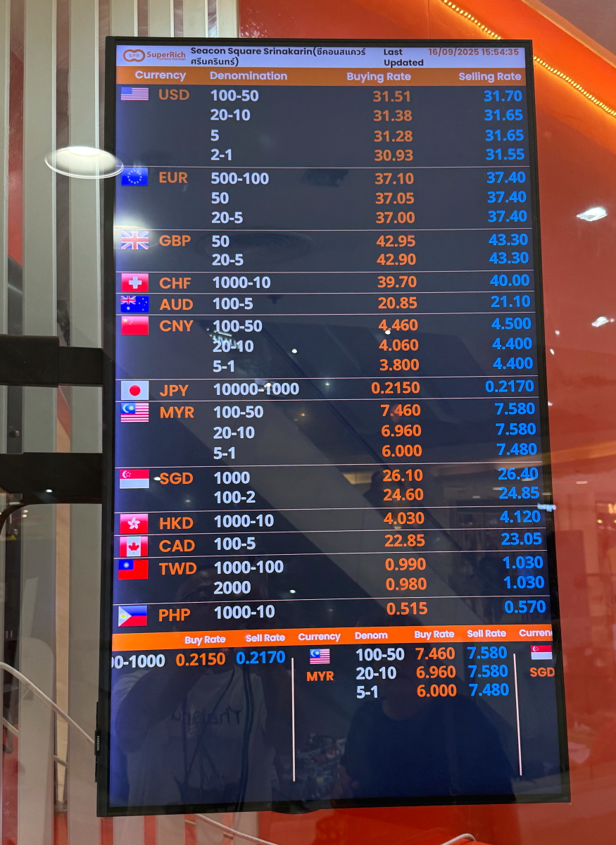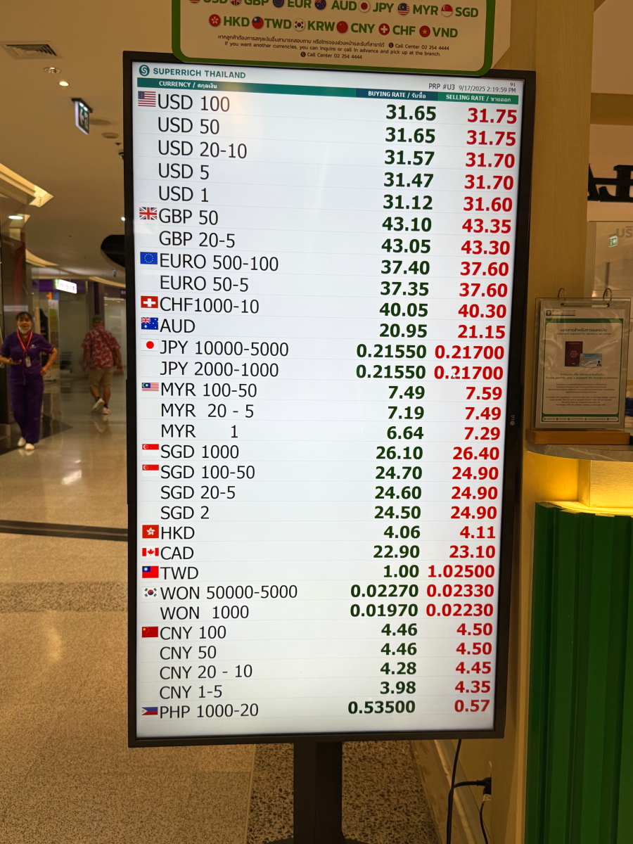 銀行で本日の両替レートをチェック、円 → バーツは0.2150でちょっと安め