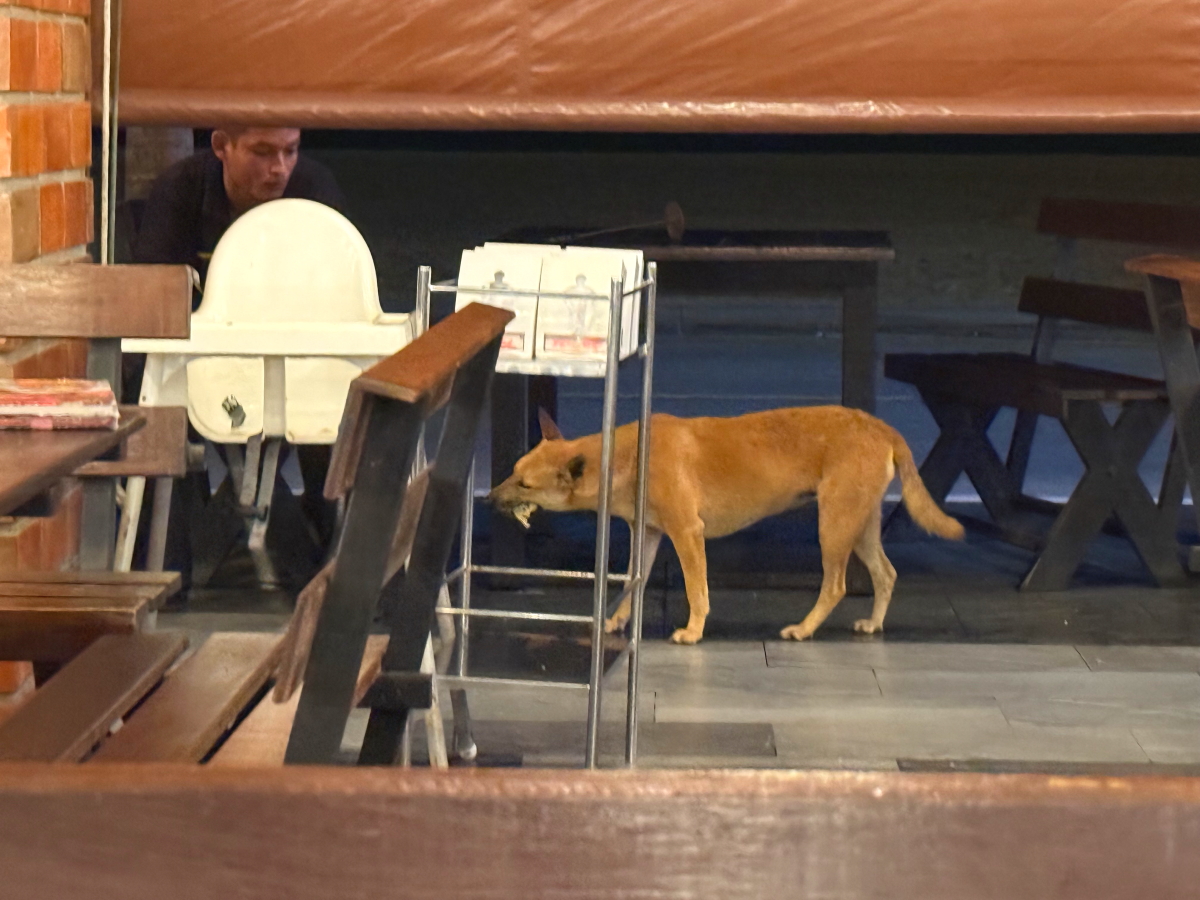 店の外にはおこぼれ待ちの野良犬、店員さんが残り物あげてます