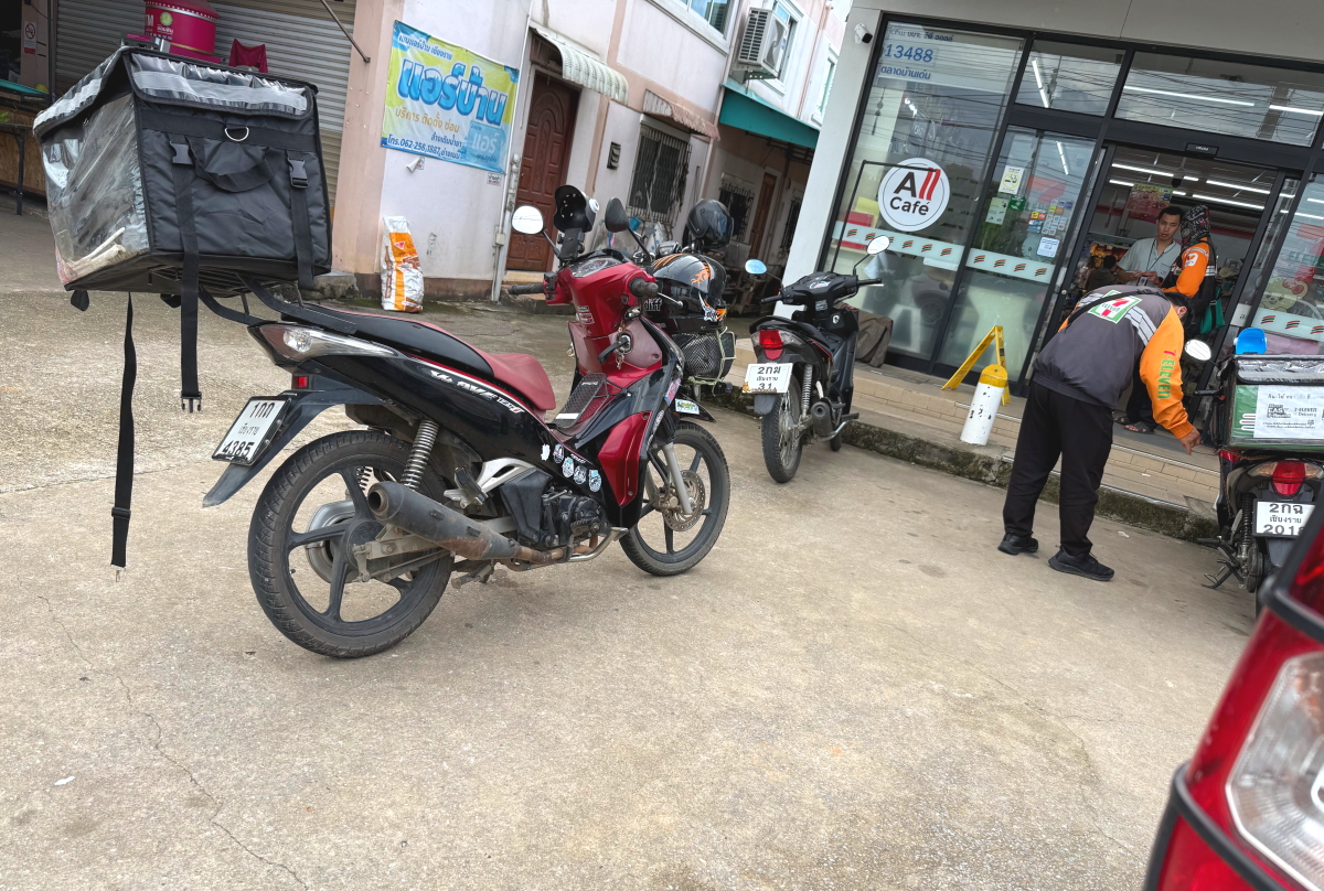 セブンイレブンの前では、配達員たちが互いのバイクを比較してました