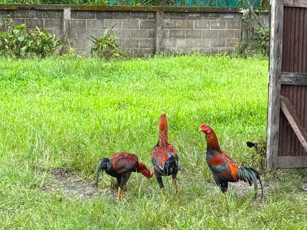 04,Oct,2025 庭の鶏達は元気に餌をついばみます、小屋の中にはたくさん隠れています