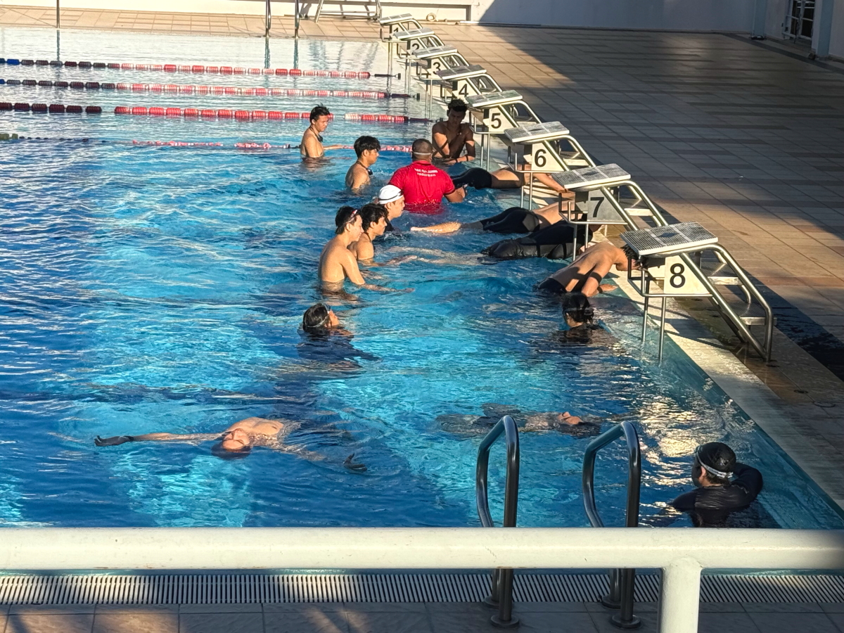 王立大学のプールに来てみたら、水泳教室で占有中、初心者コースでした