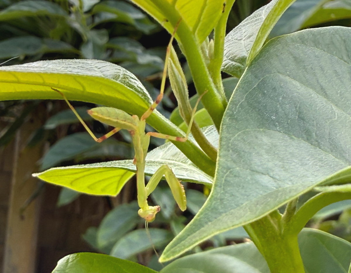 21,Oct,2025 庭の木にカマキリの子供がぶら下がって擬態化、見えないつもり・・・
