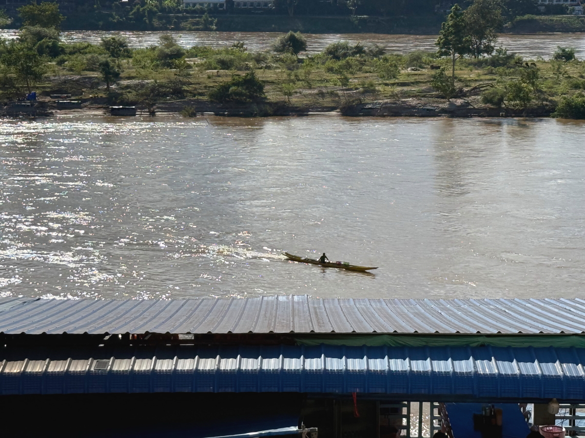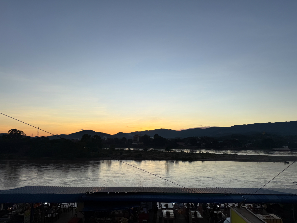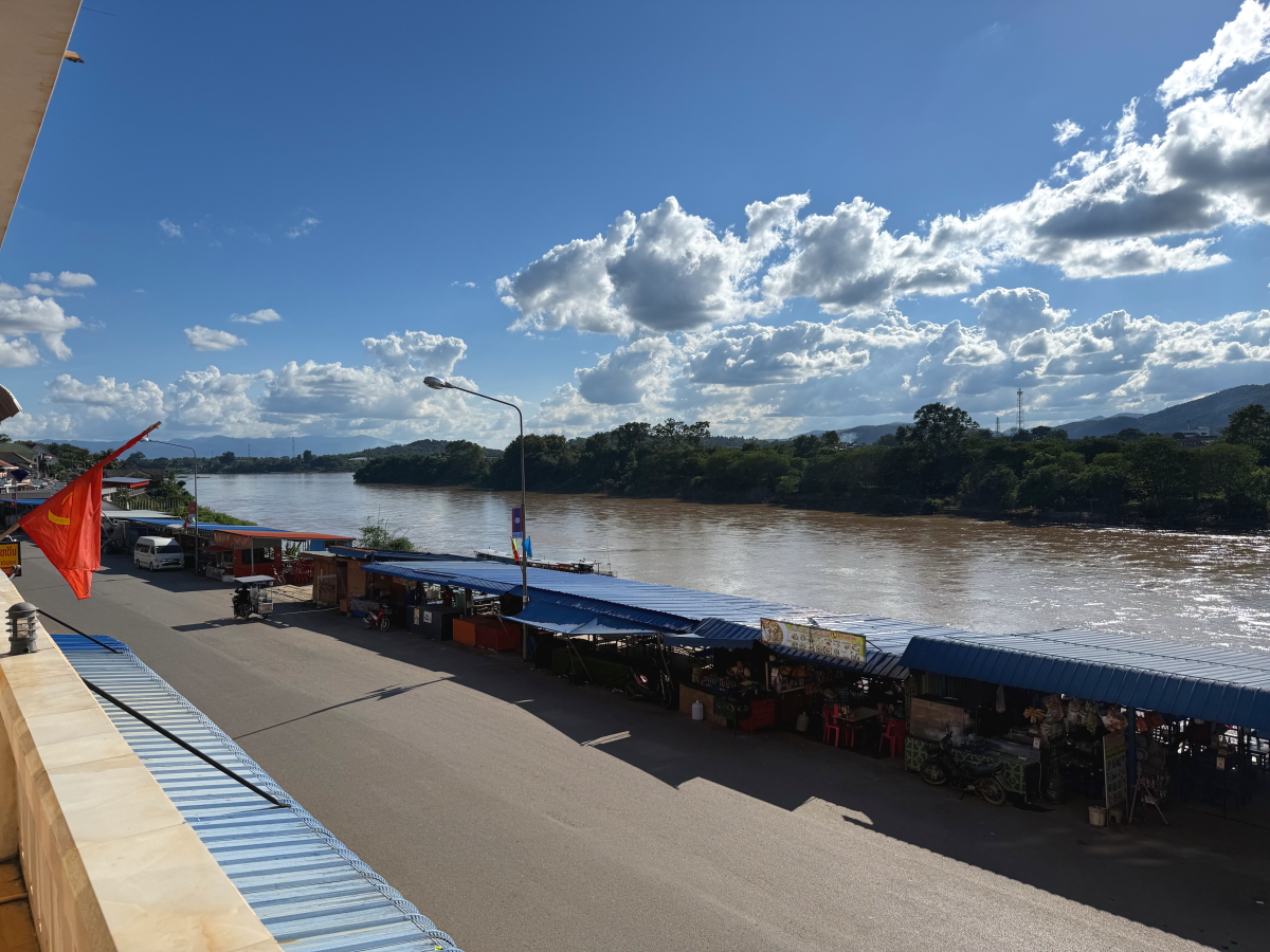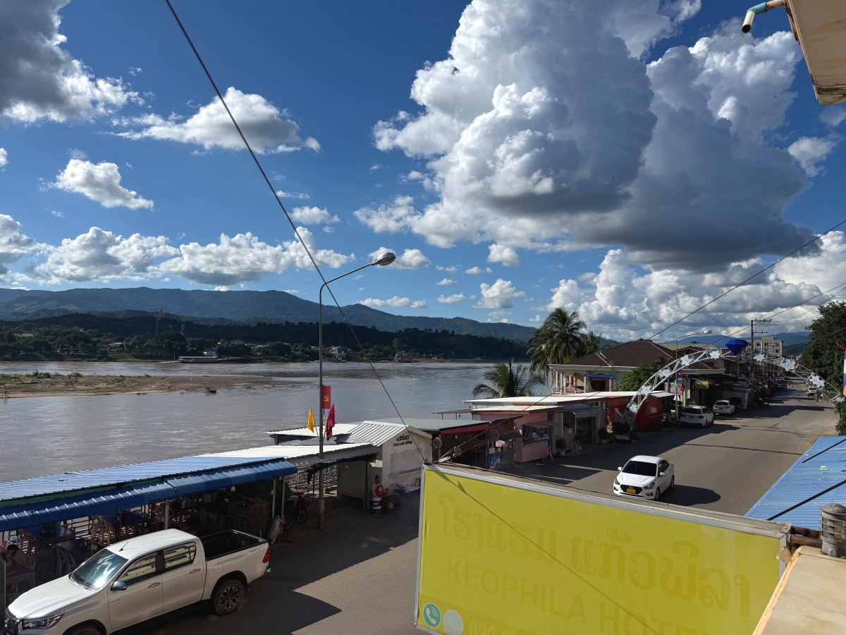 山の斜面側の部屋だったのを、川側に変えてもらって、部屋からメコン川を眺めます