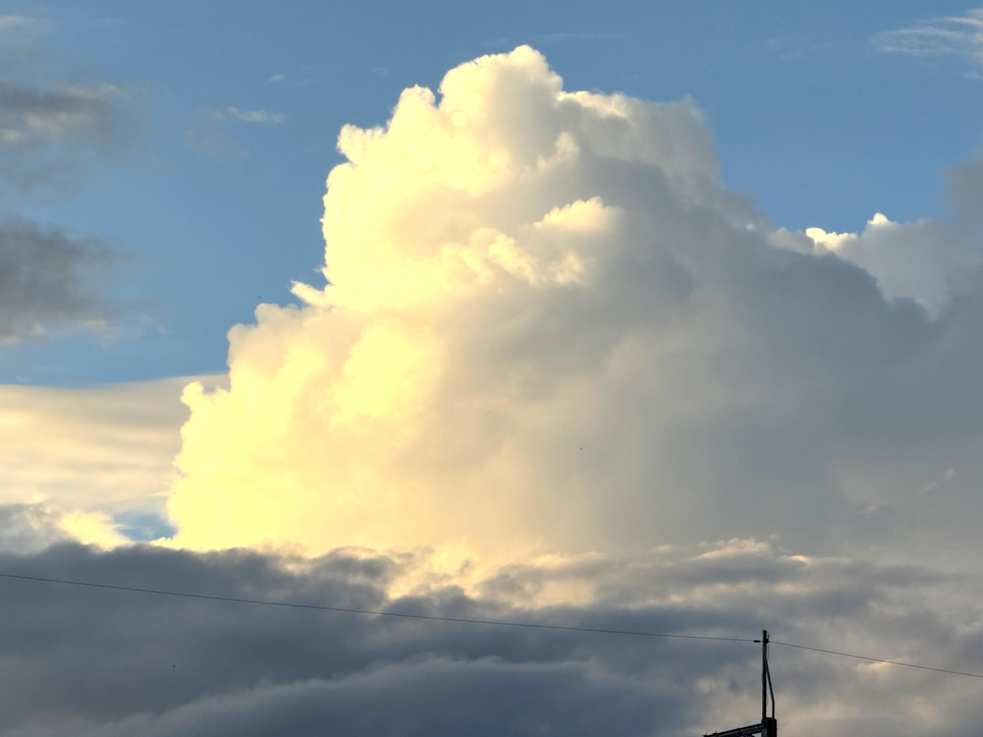 夕暮れ時の東の空、西陽を浴びる雲が輝きます