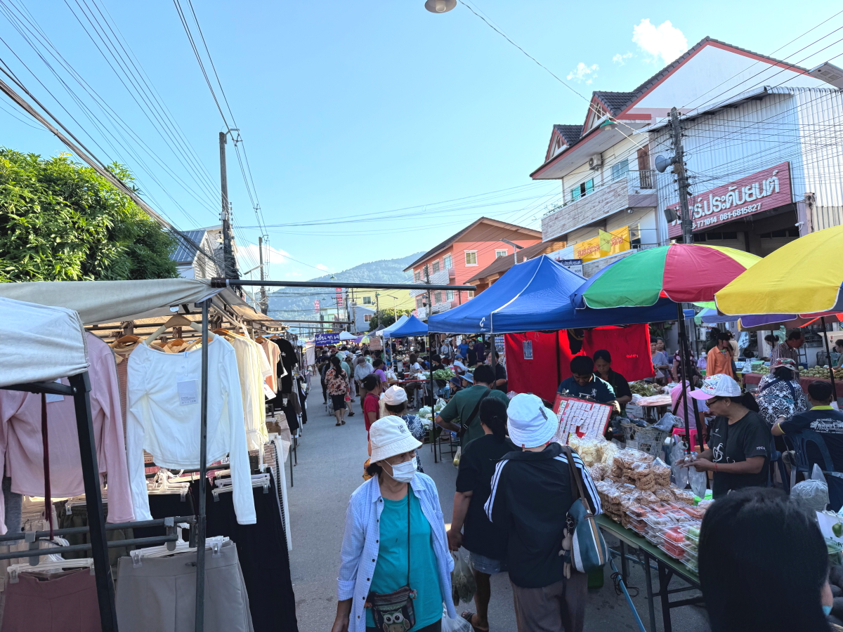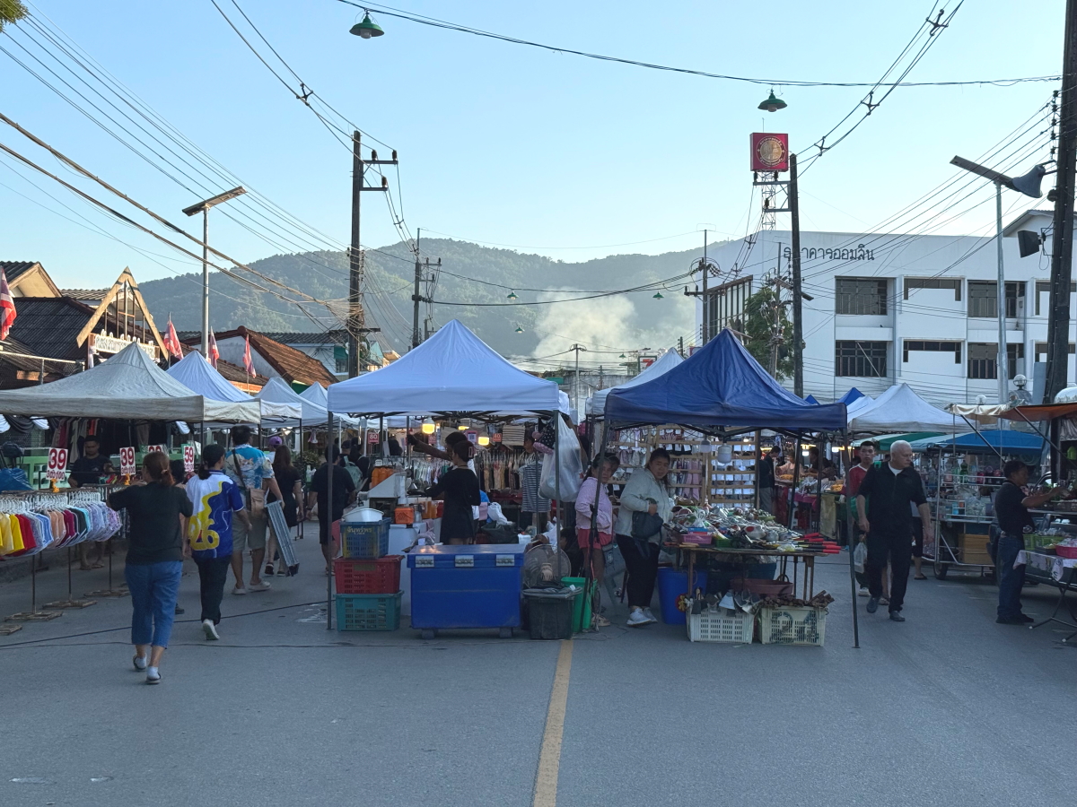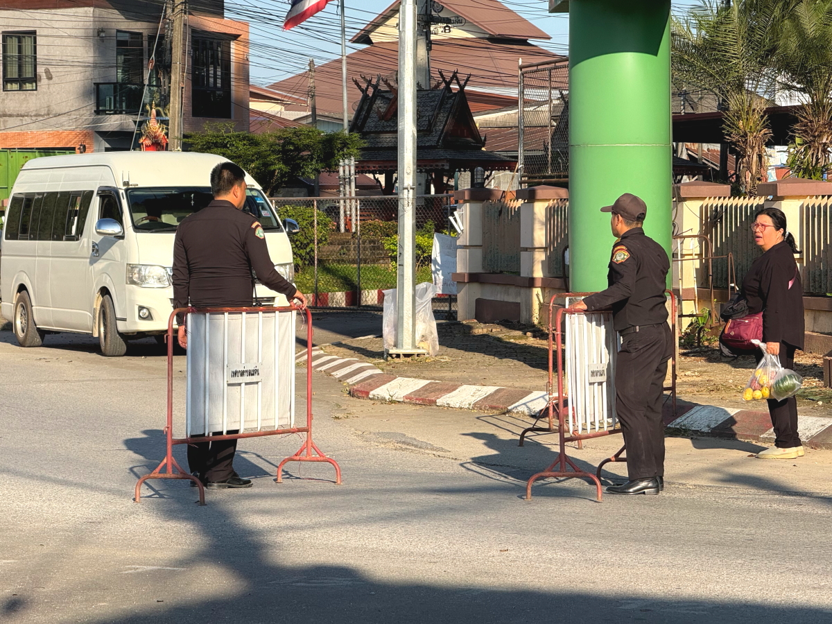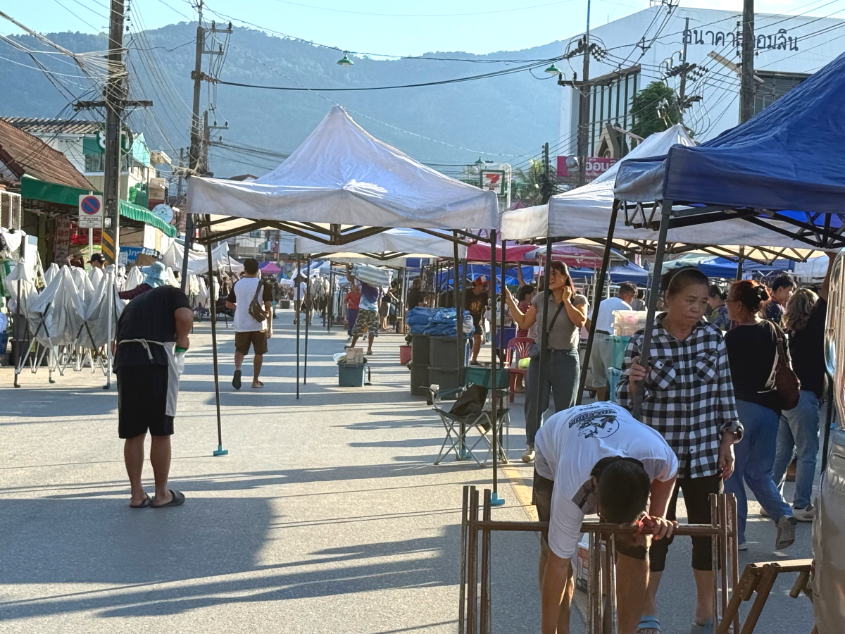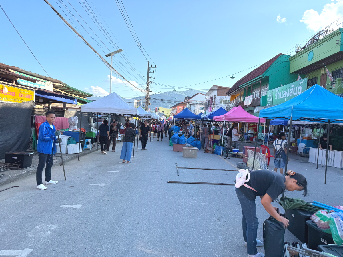 金曜開催のメーチャンの街の市場、警官達が道路封鎖の作業中
