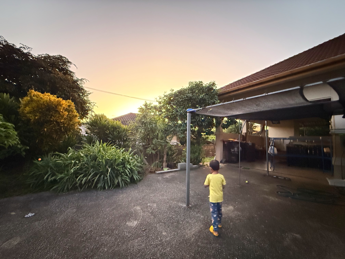 夕暮れバックに遊ぶチビ
