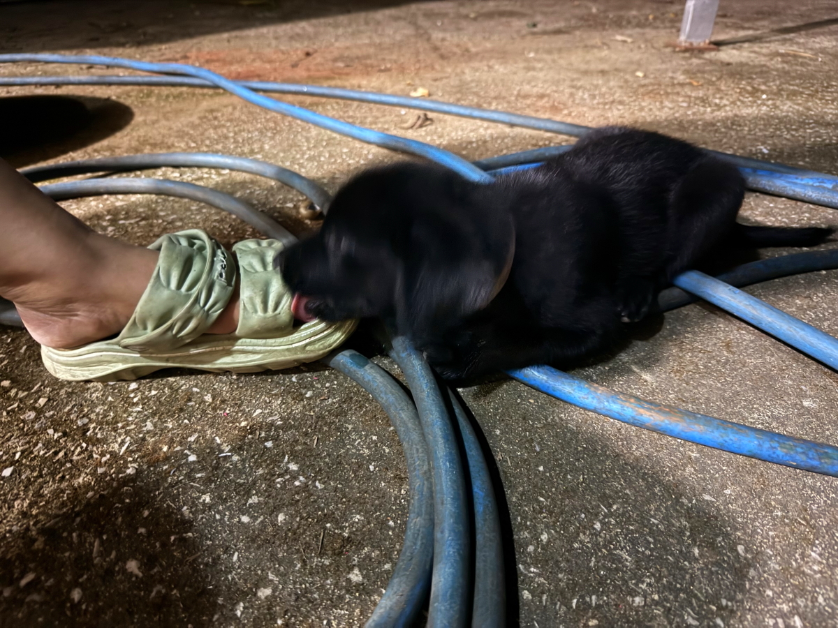 ソーラーセルで光る灯の下でワンコが戯れつきました