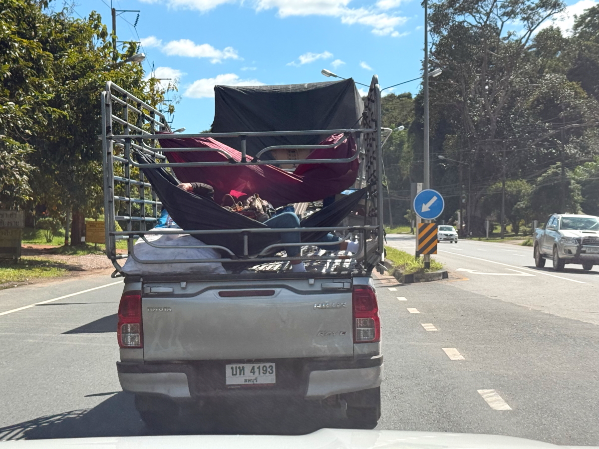 病院を移動、トラック荷台にハンモック掛けて寝ながら移動する強者達
