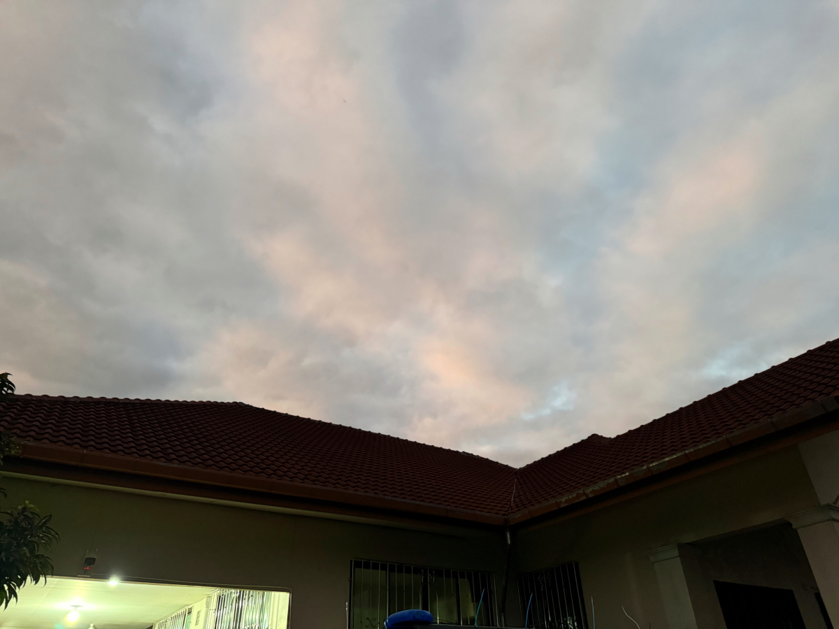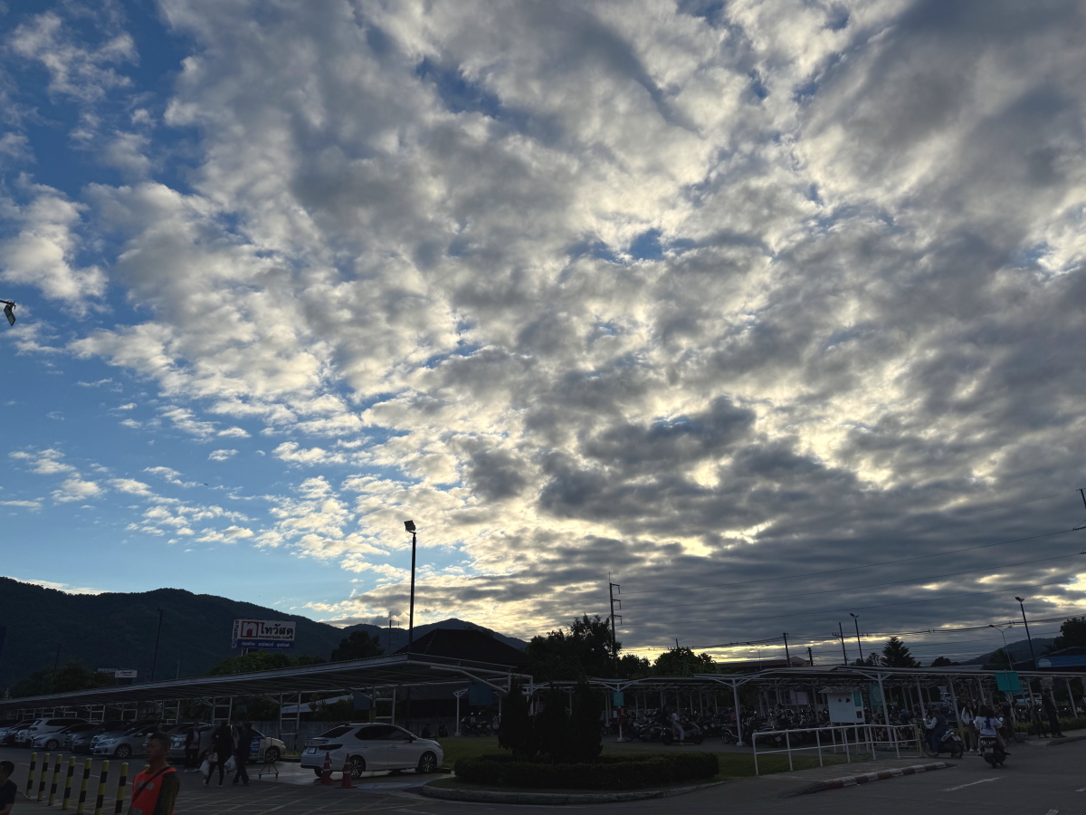 西の空には、夕暮れのオレンジ雲がマダラ模様