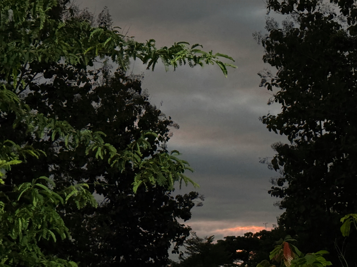 夕焼けは雲が多くて、地平のところだけオレンジ色に