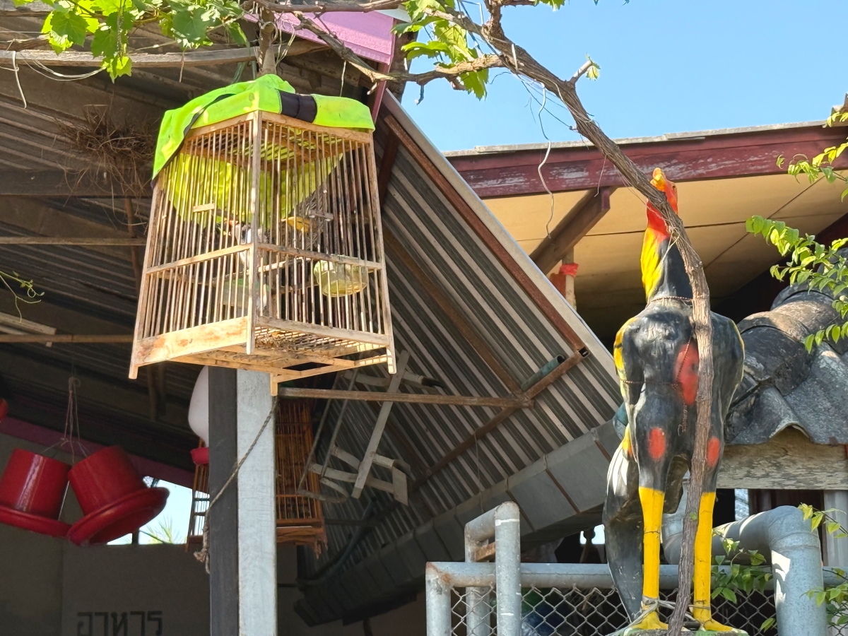 軒先でカゴに入った鳥がさえずってました