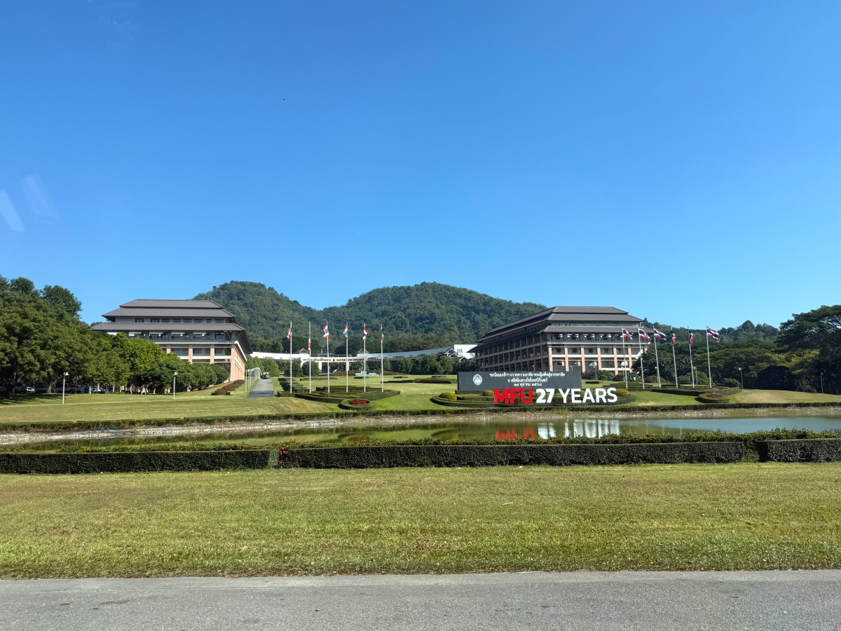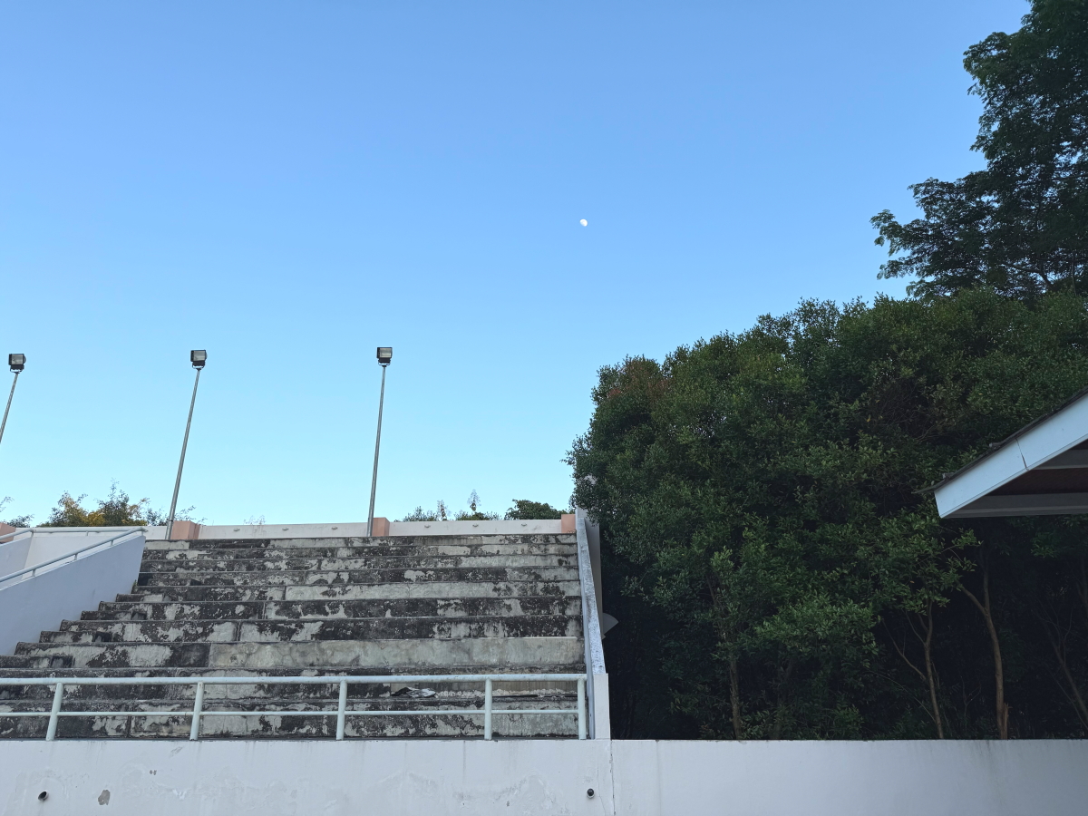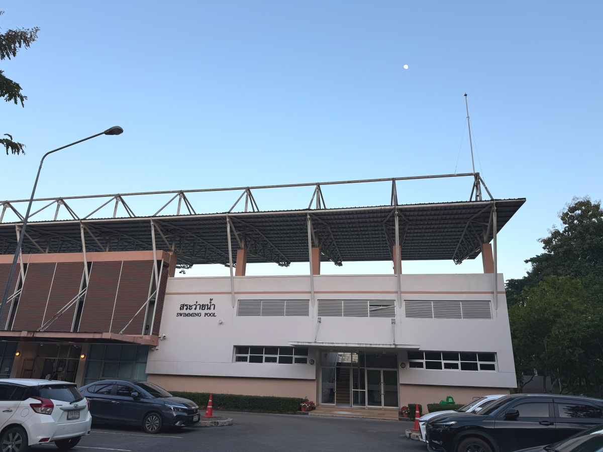 プールがメンテ時間で一旦食事に出かけます、昼間の本校舎も綺麗