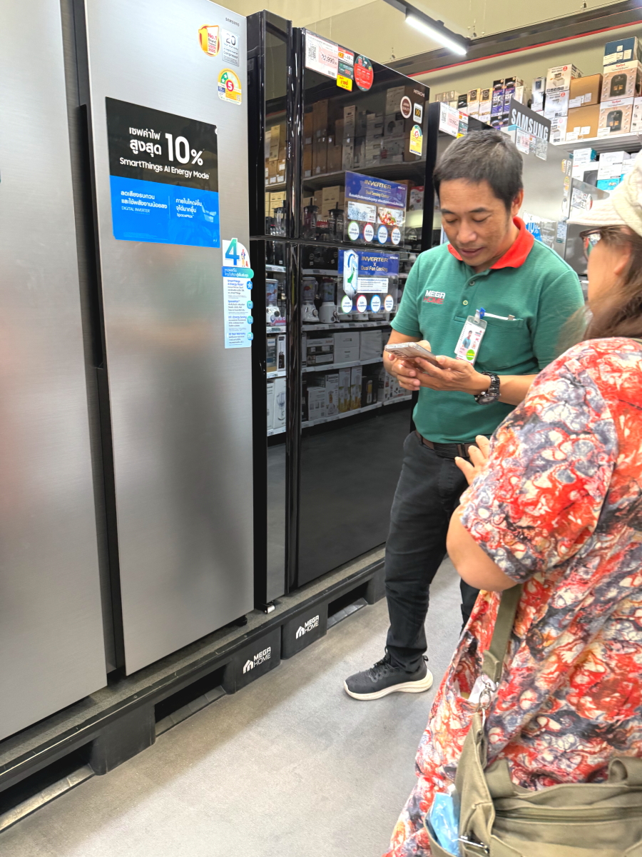 冷蔵庫の説明を一生懸命してくれる店員さん