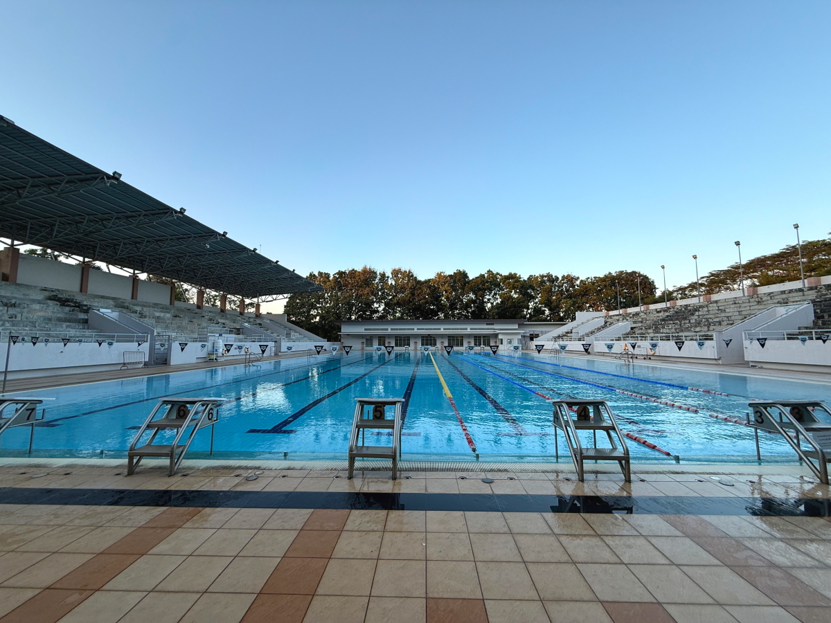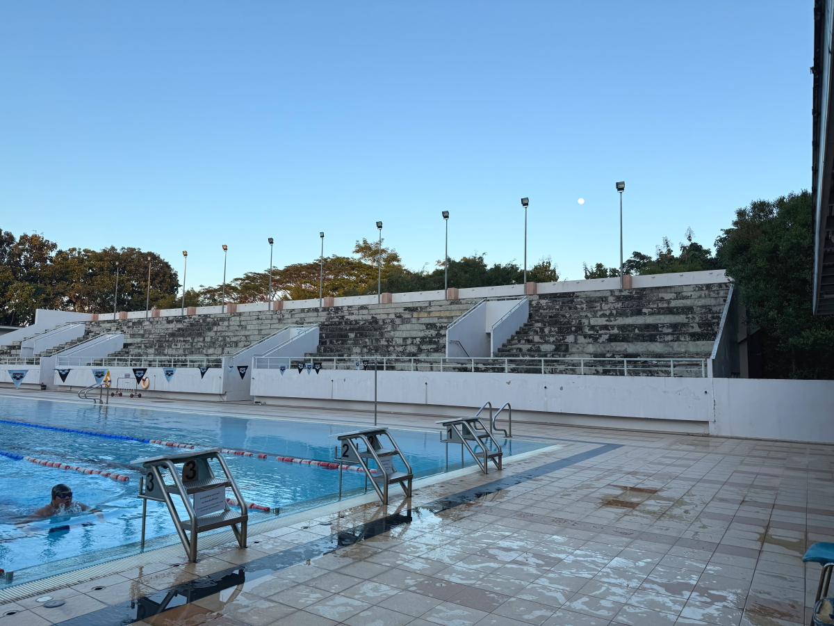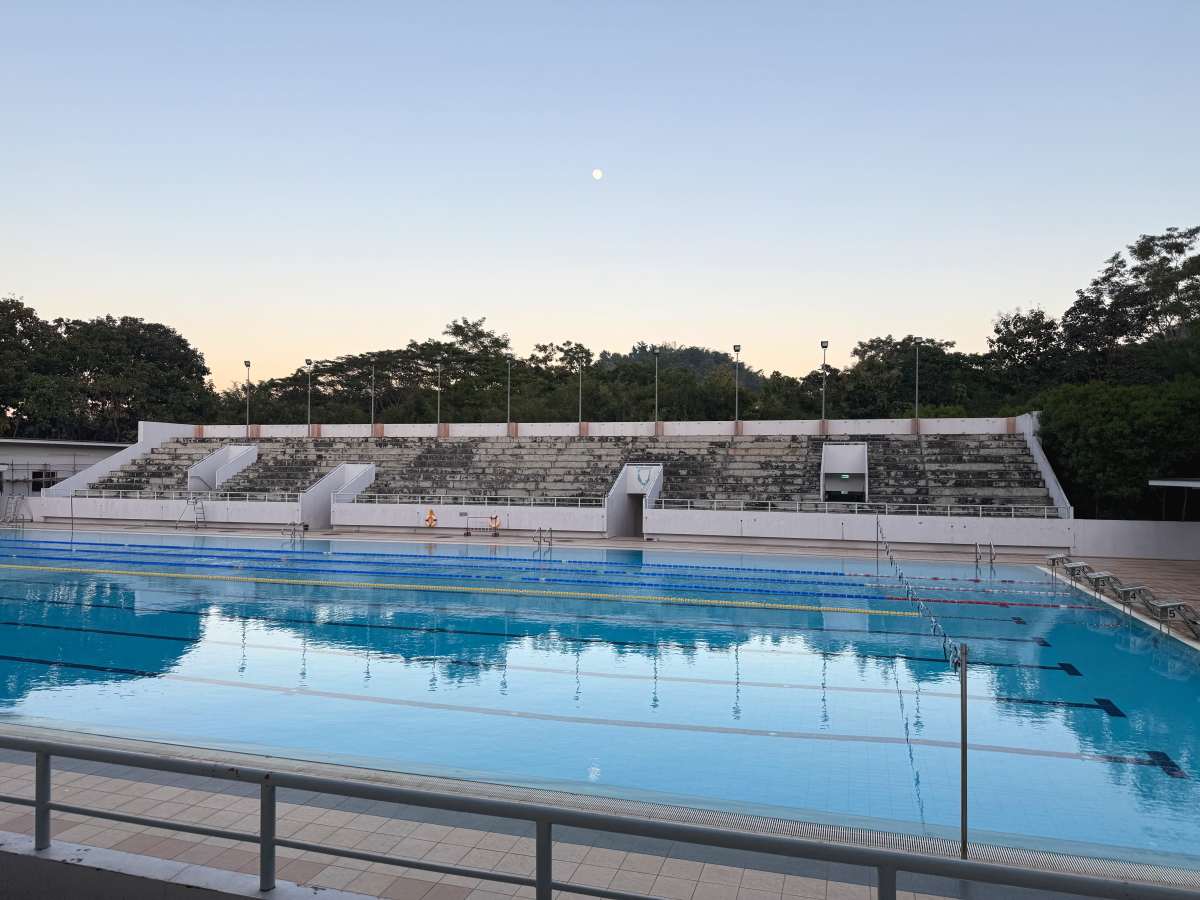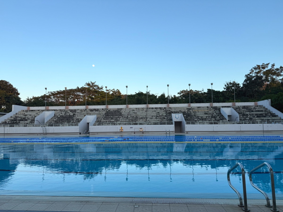プールの上にお月様が浮かんで、ブレストのお兄さんが練習中