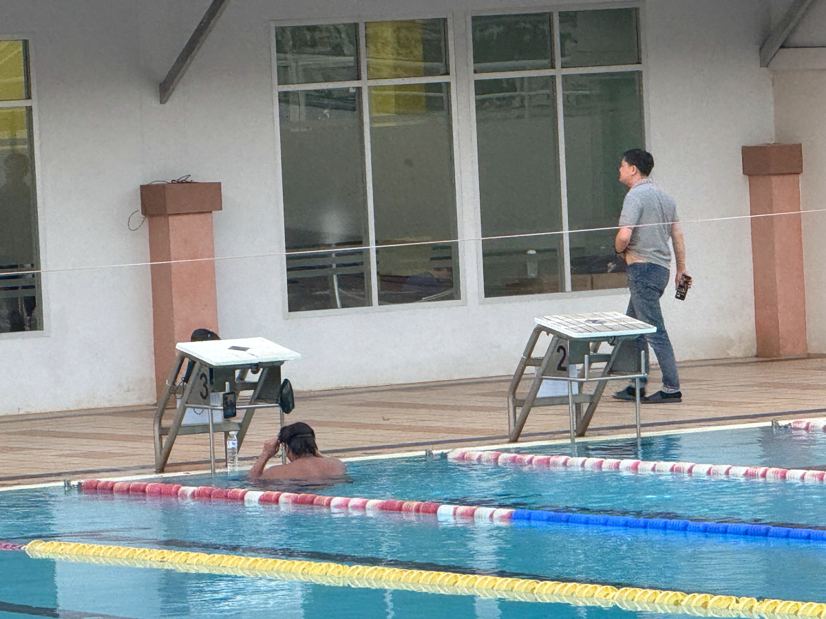 ブレストのお兄さん、スタート台につけたスマホでコーチから指示受けてました