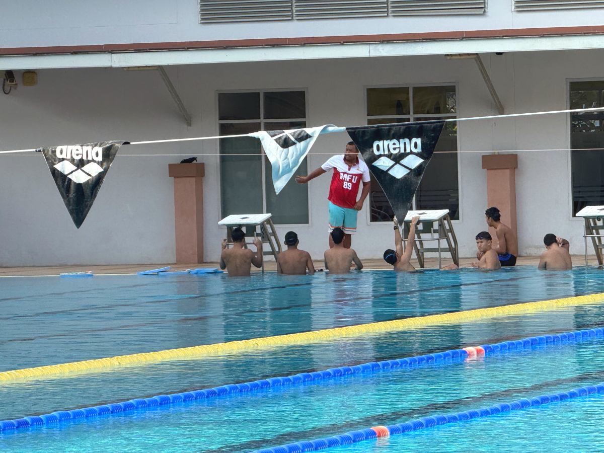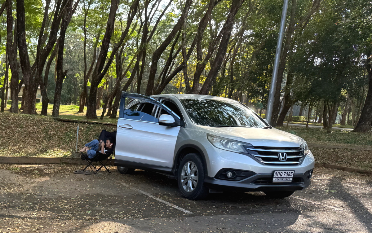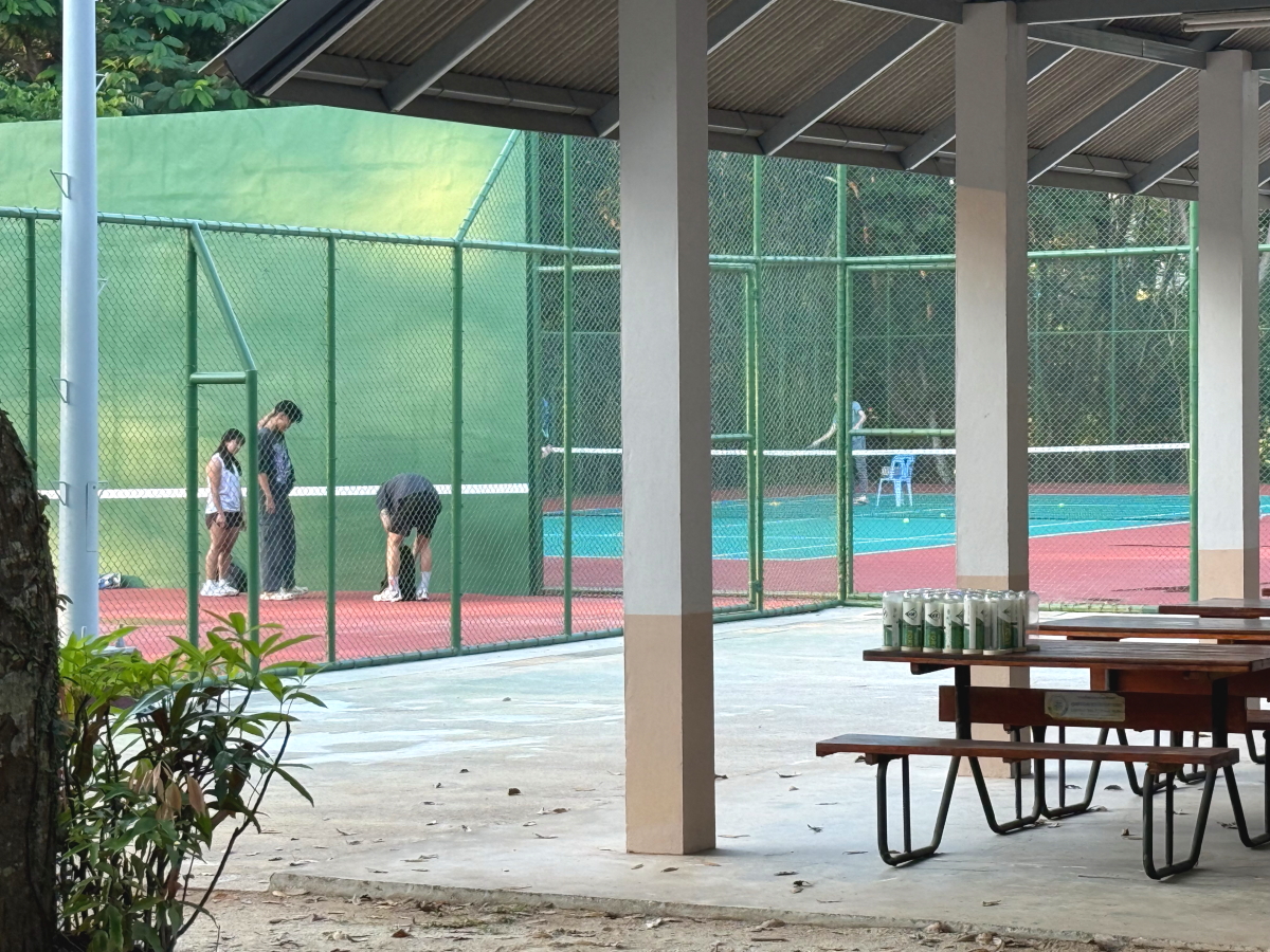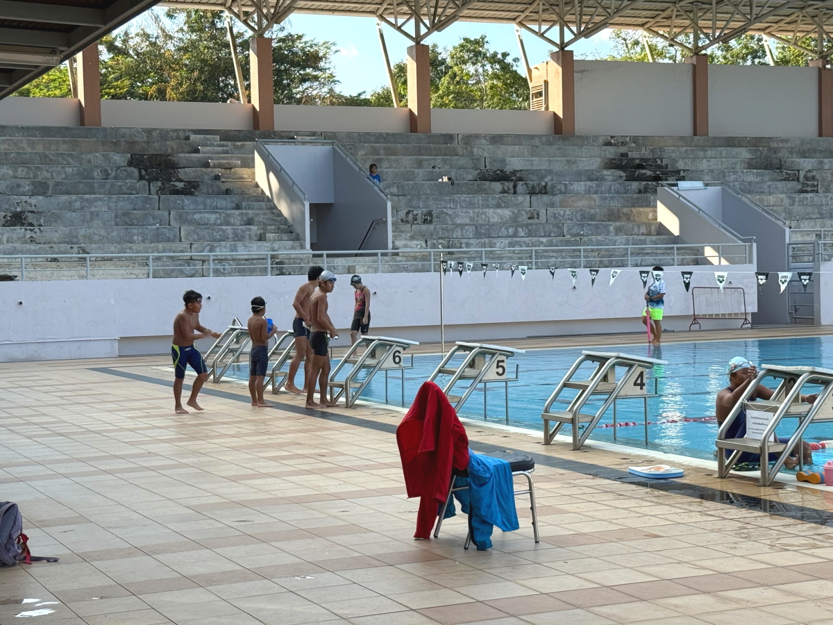 プール駐車場でくつろぐ子供、お兄さんが練習中かも?