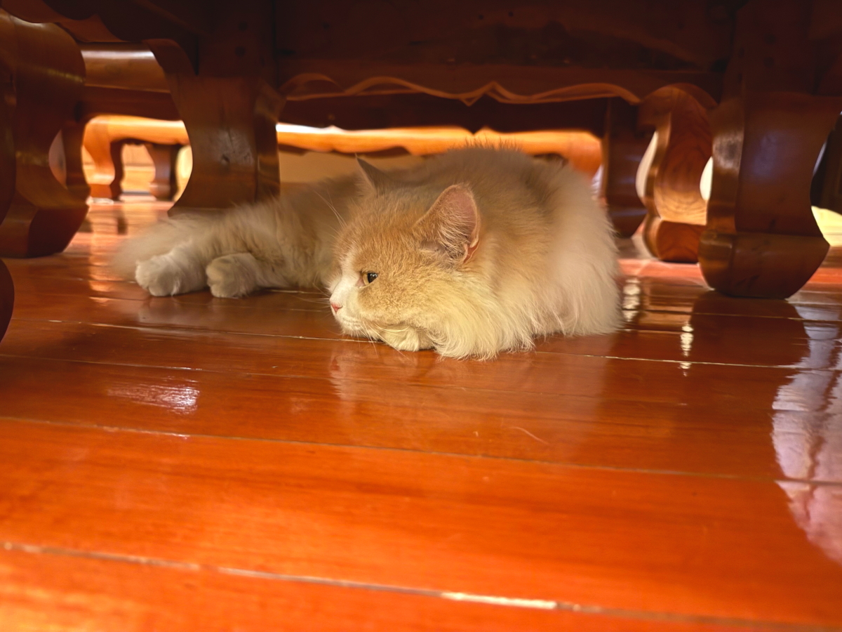 17,Dec,2025 もふもふで暑すぎる猫は椅子の下の冷たい床で寝てます
