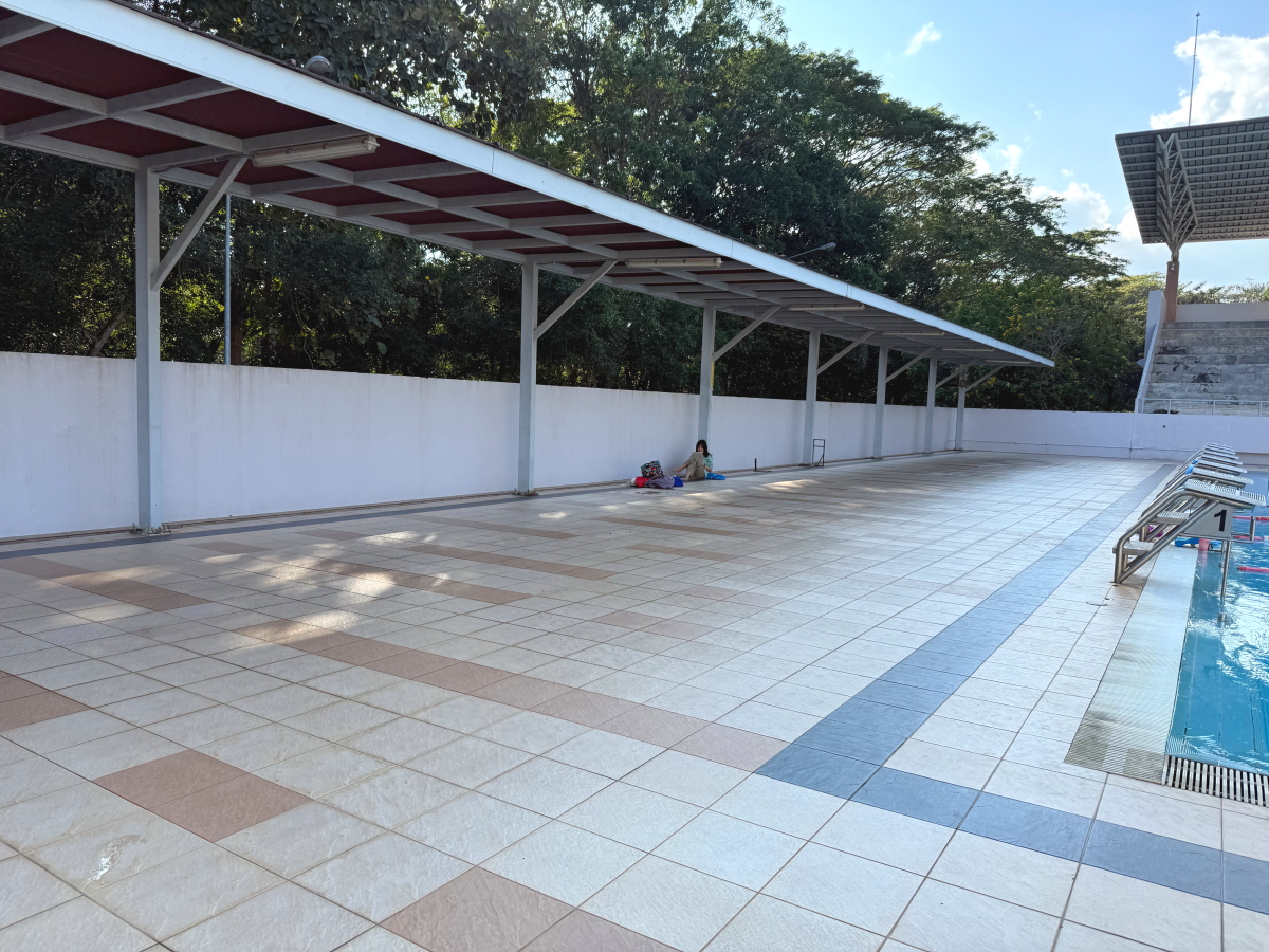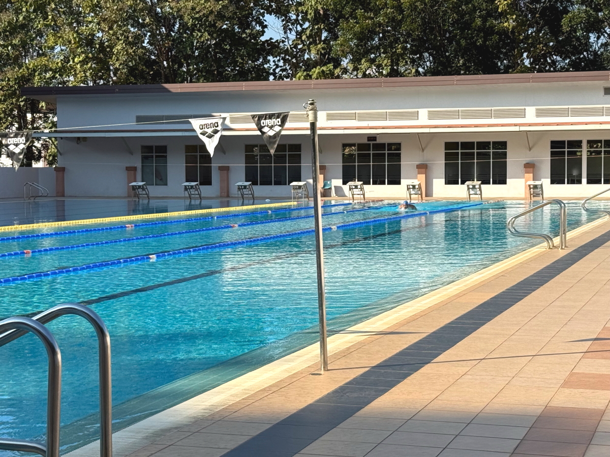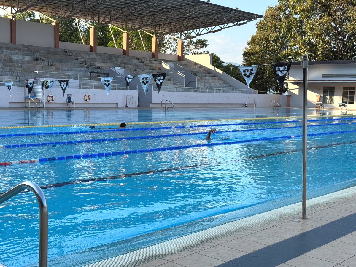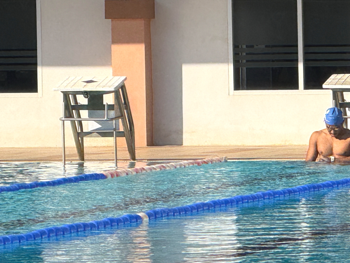 プールにはいつもの競泳チーム、コーチはプールサイドでタブレットをチェック中