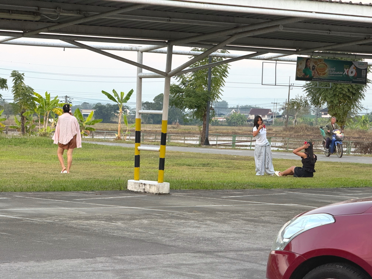 駐車場横の広場で、女子たちが何かの練習を始めました