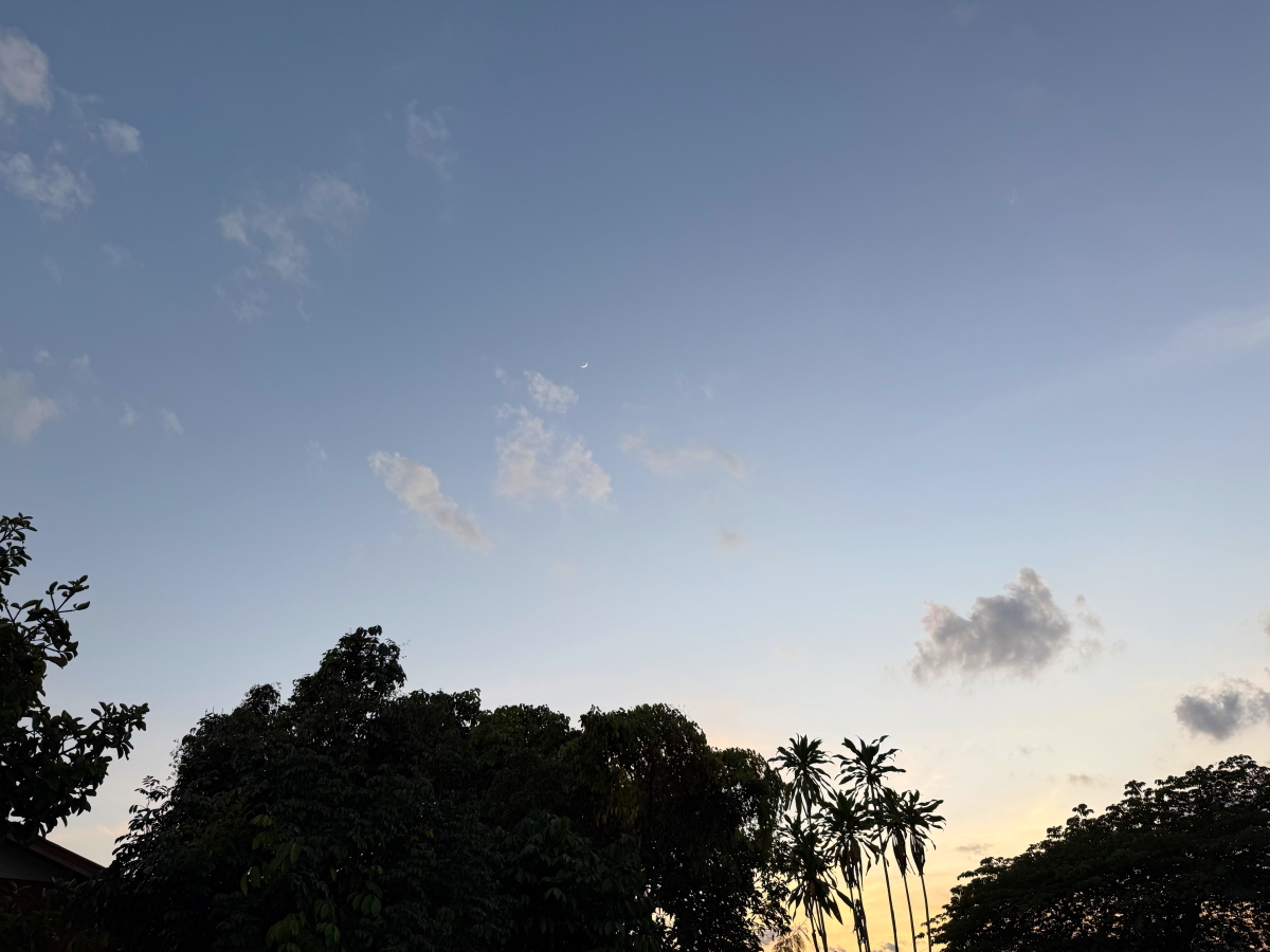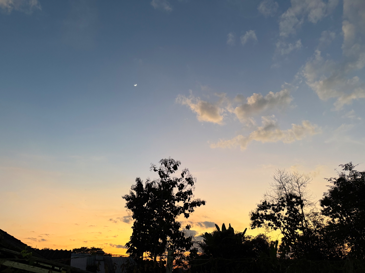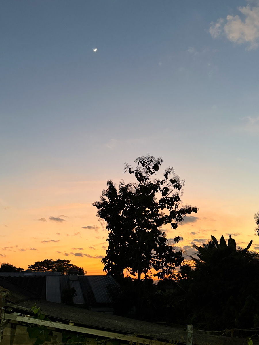 木の上に細い三日月が浮かびました、絵葉書見たいに綺麗です