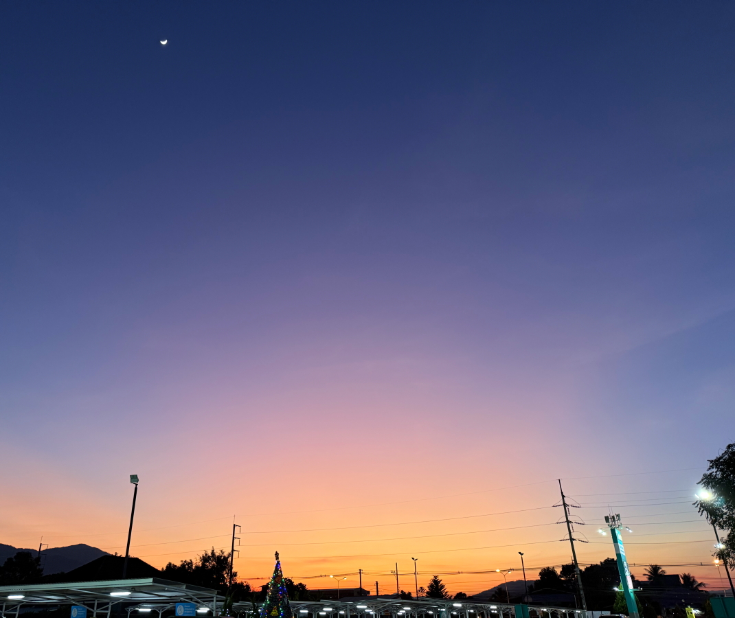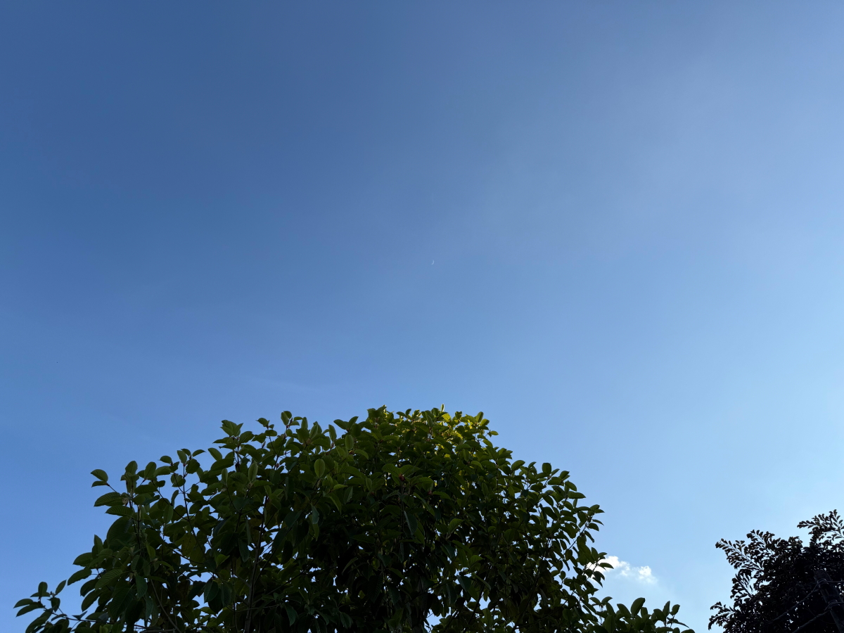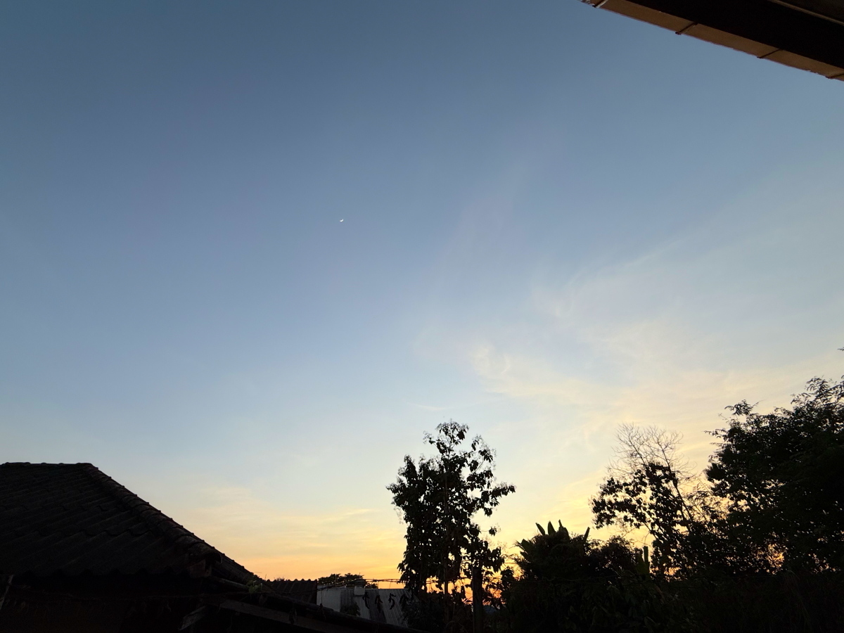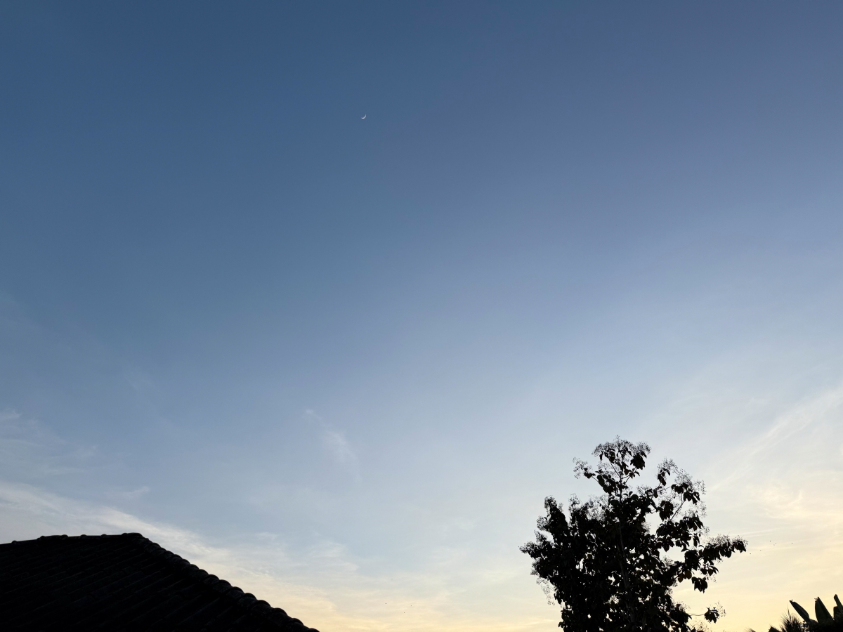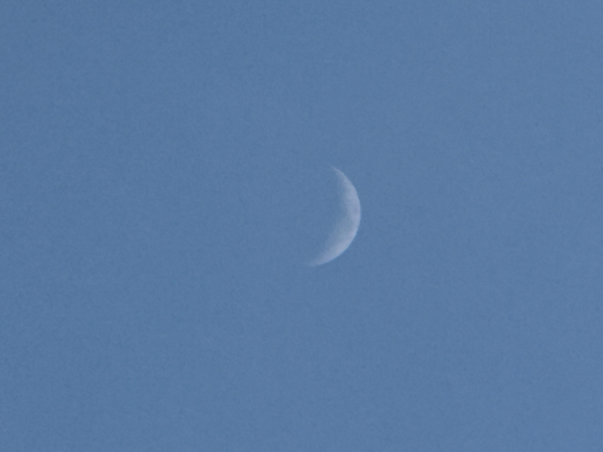 西の空に細い月が浮かんでます(画面中央、よく見ないと見えないかも)