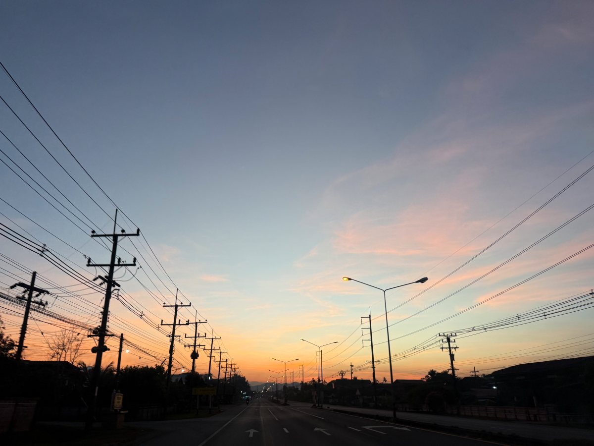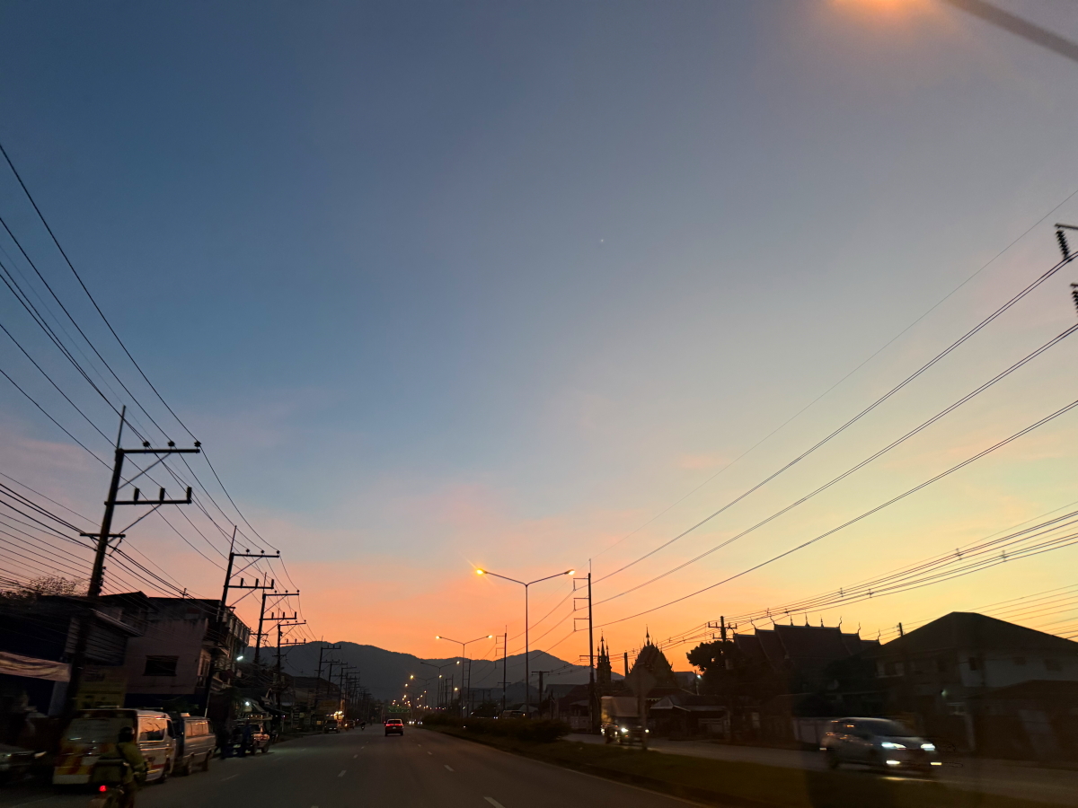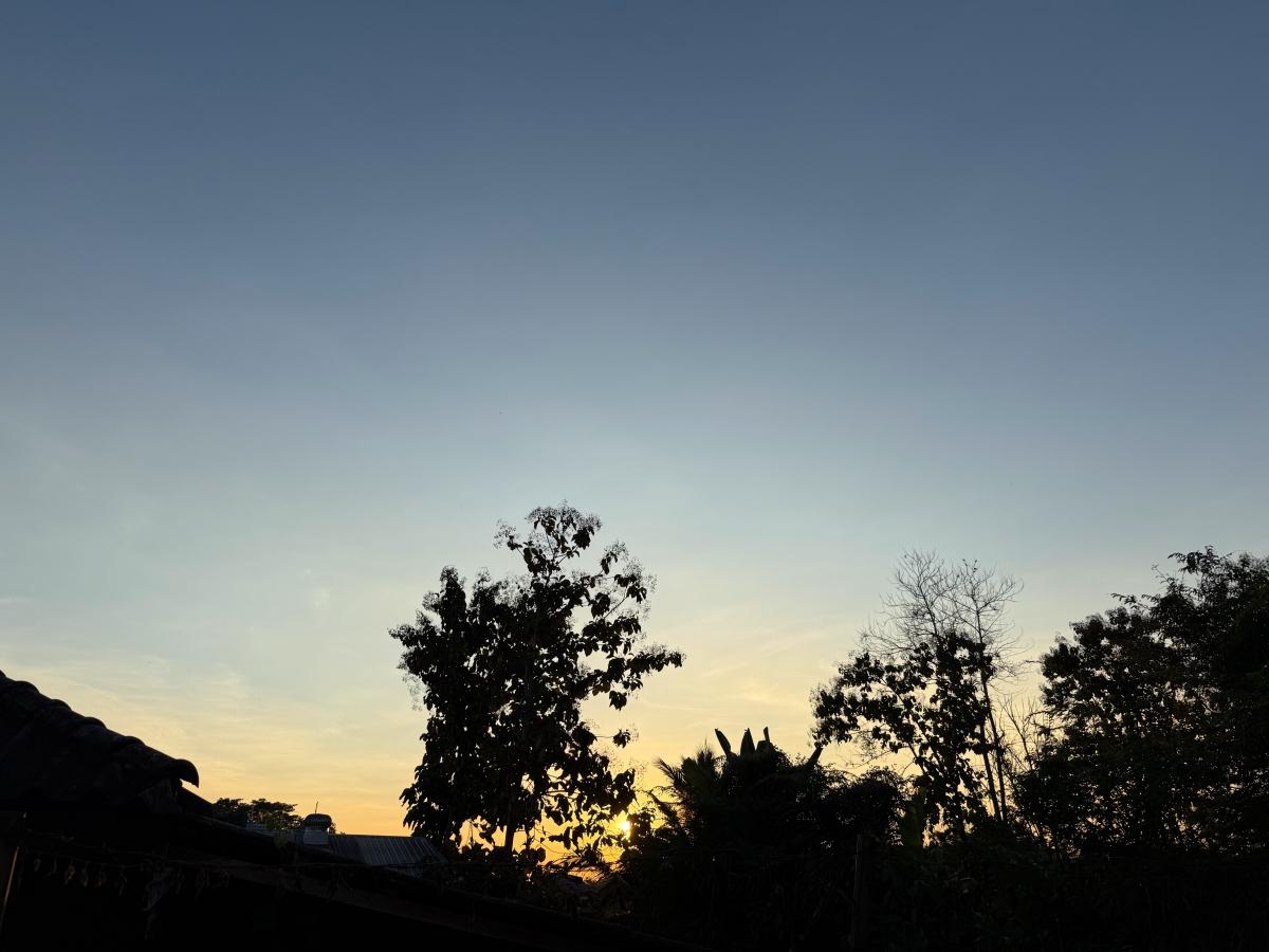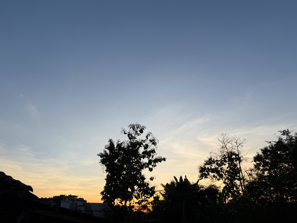 西の空に細い月が浮かんでます(画面中央、よく見ないと見えないかも)