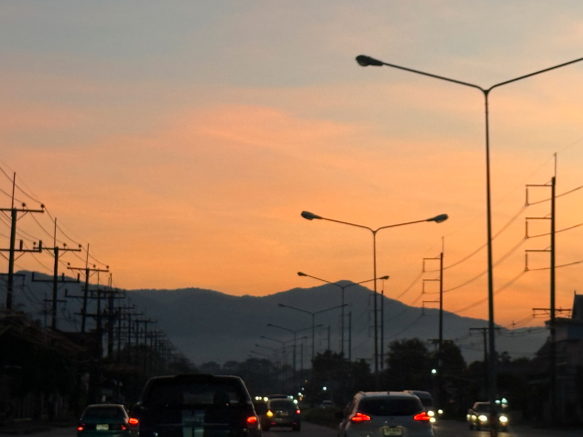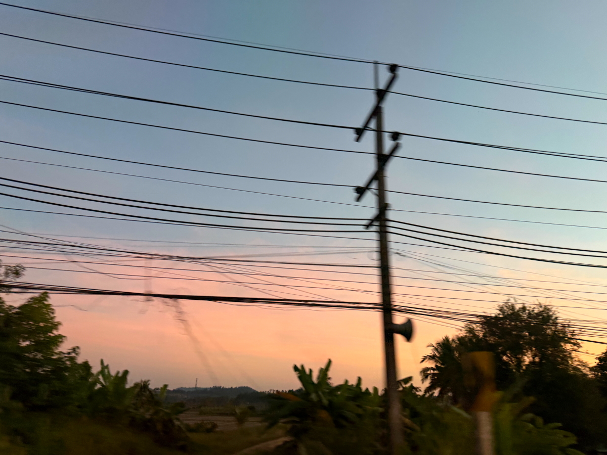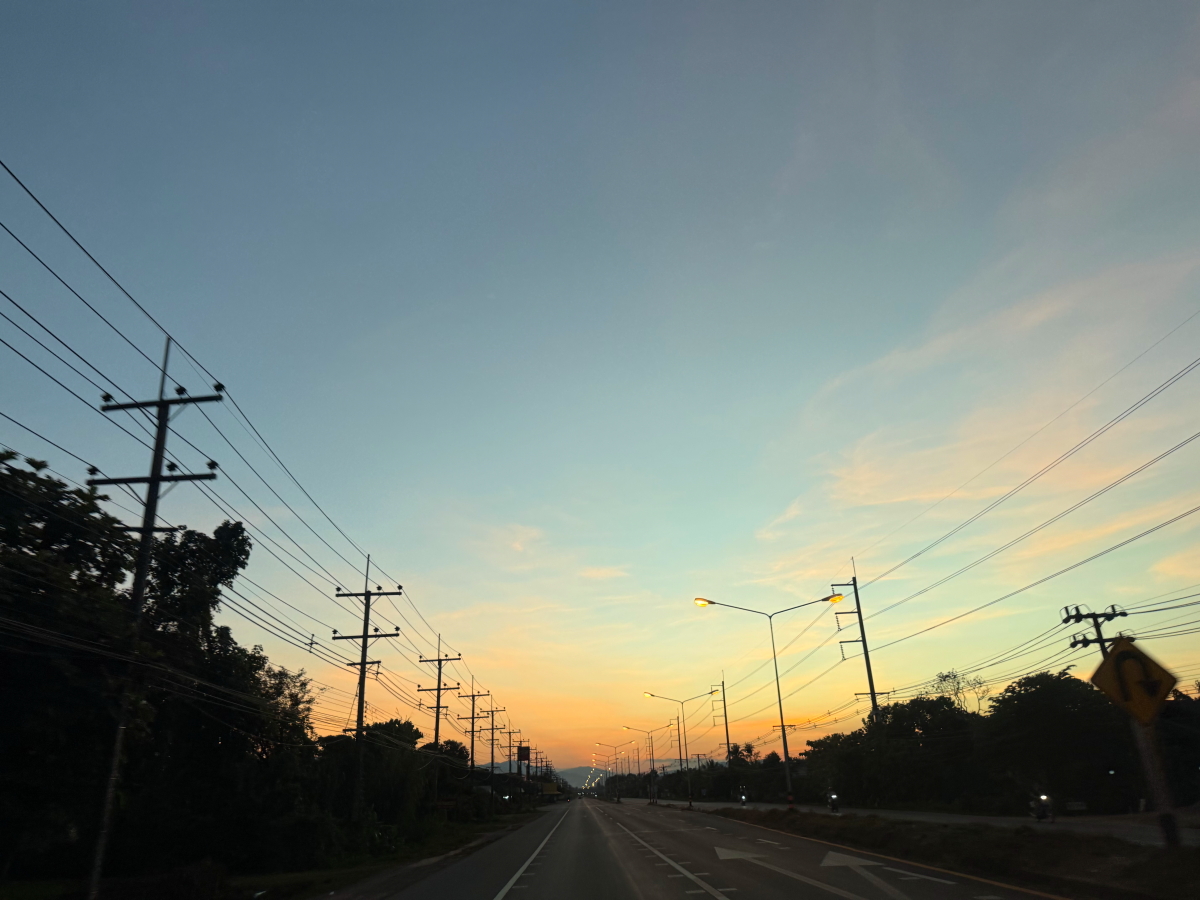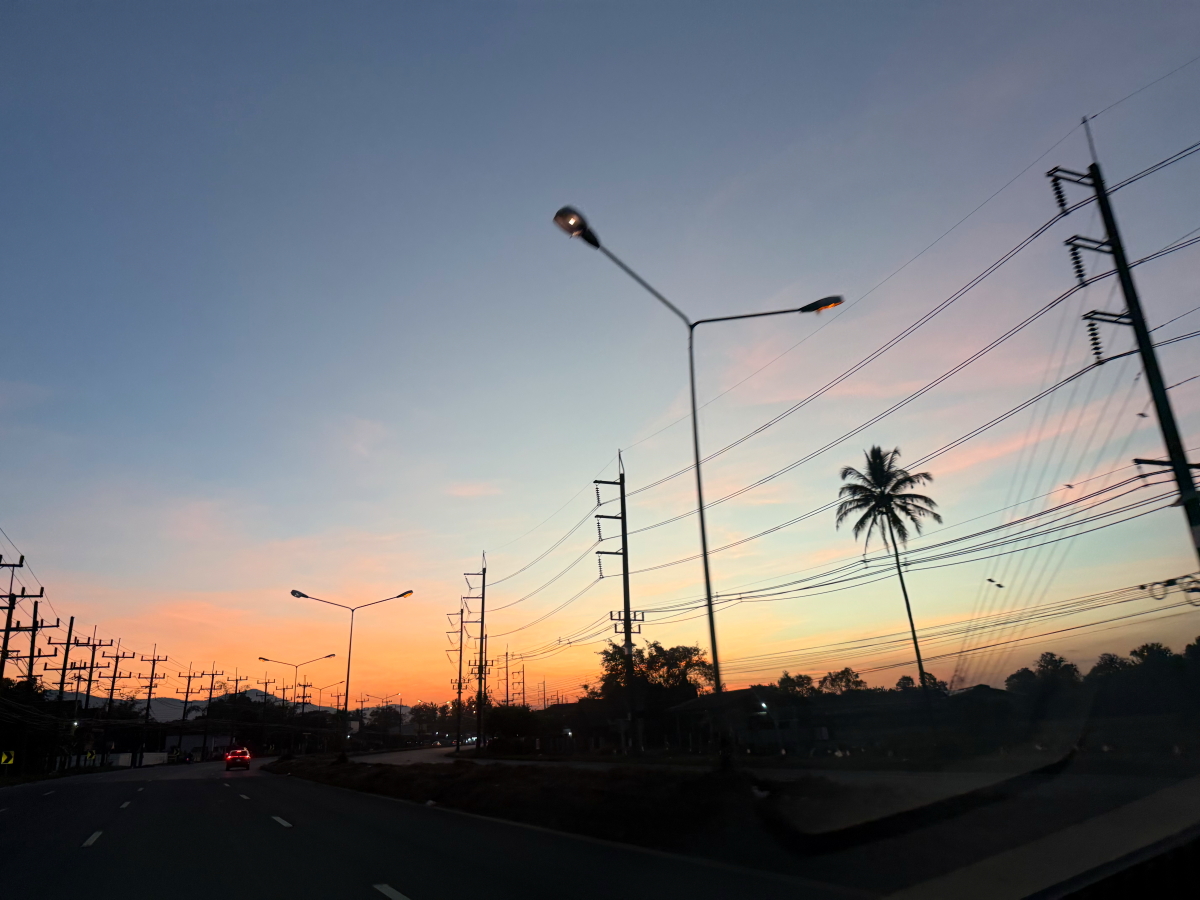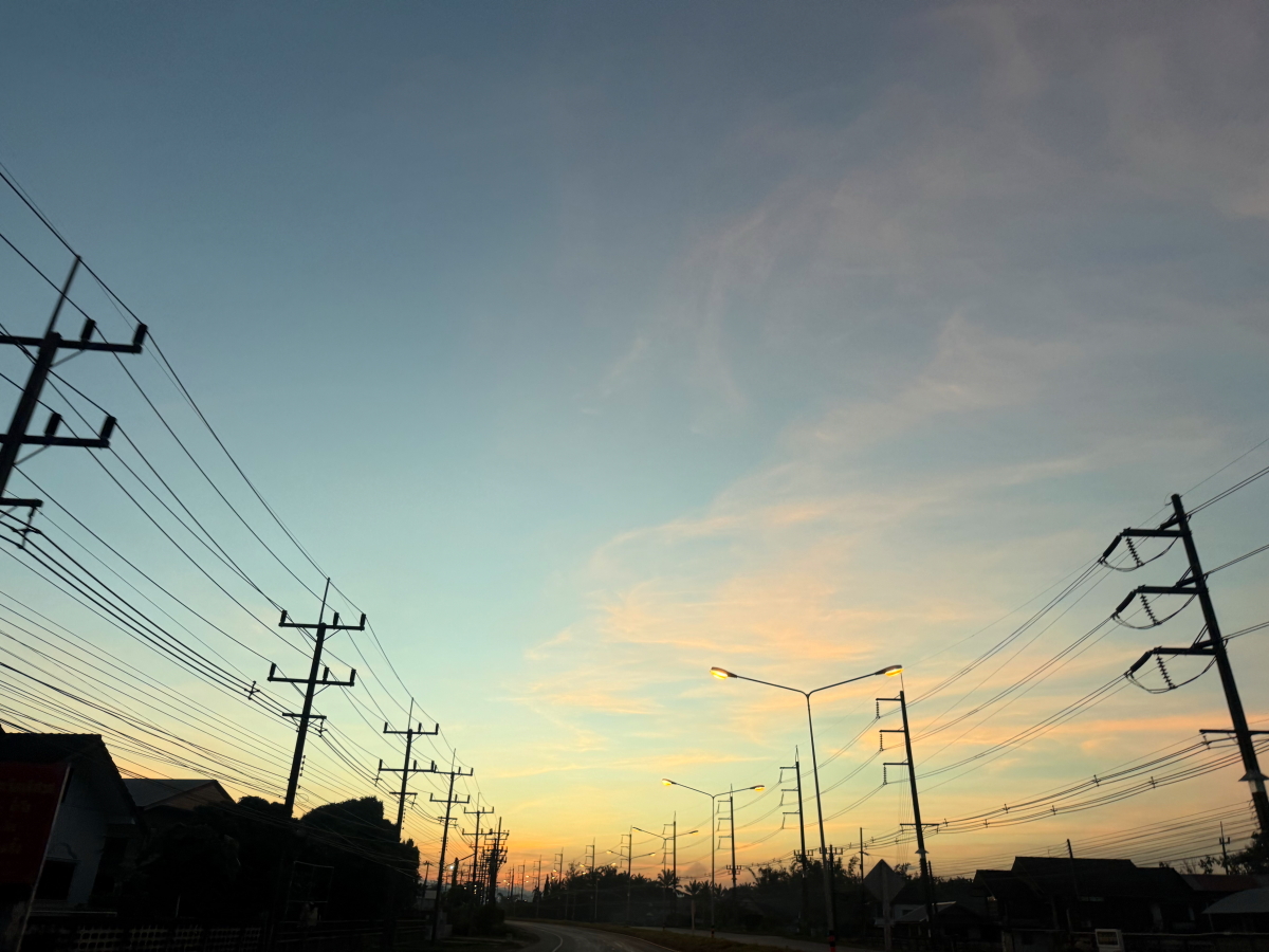 西の空に細い月が浮かんでます(画面中央、よく見ないと見えないかも)