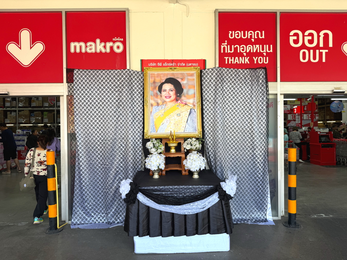 王立大学の正門、王族の喪中パネルが展示中