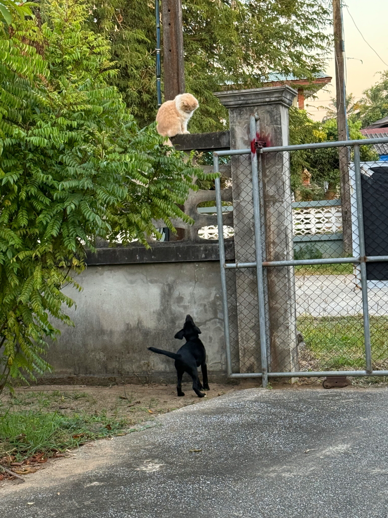 わんことベテラン猫ちゃんは、門の上と下で睨めっこ