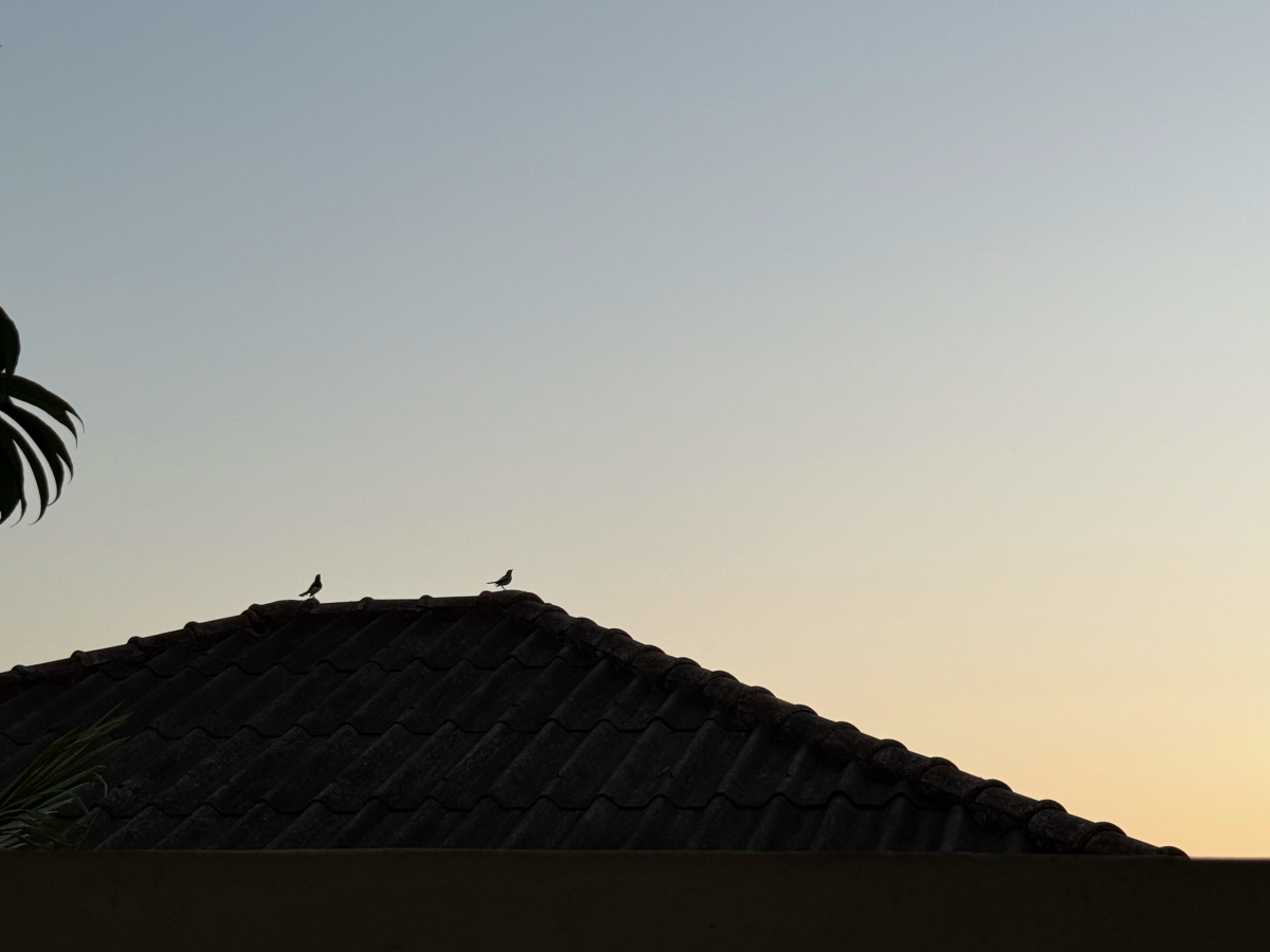 夕焼けバックの屋根にも鳥さん達
