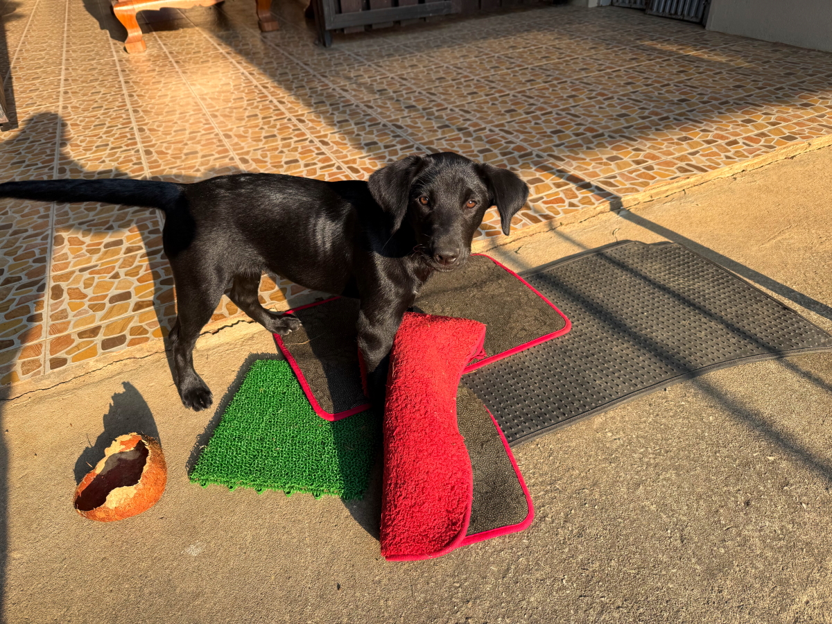 遊び盛りのチビは朝日の中でマット遊び