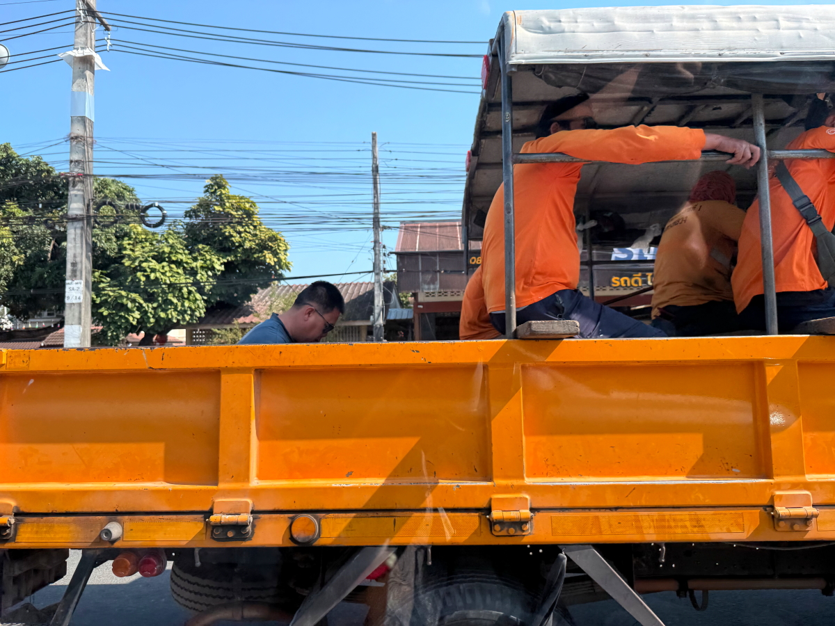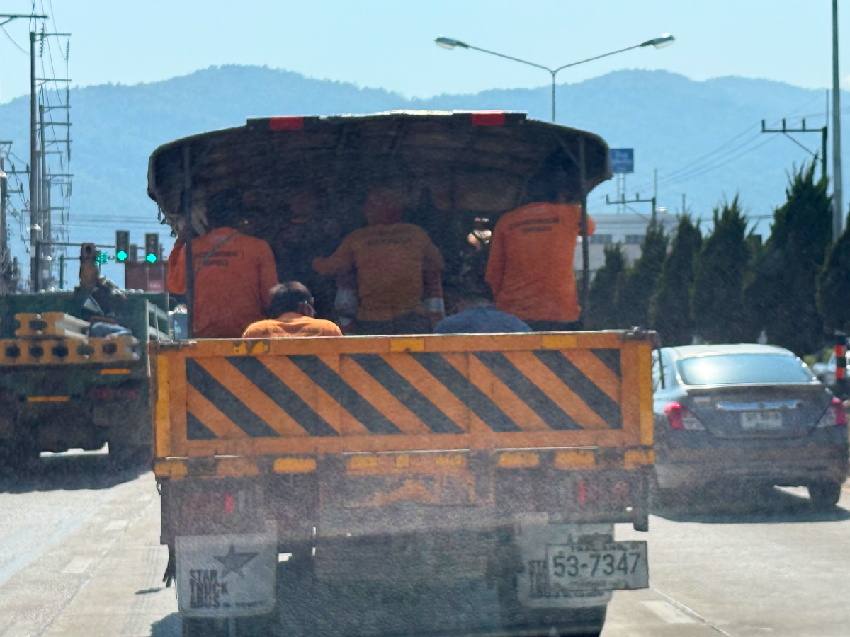 月曜の道路にはお仕事で移動する荷台乗車の人たち