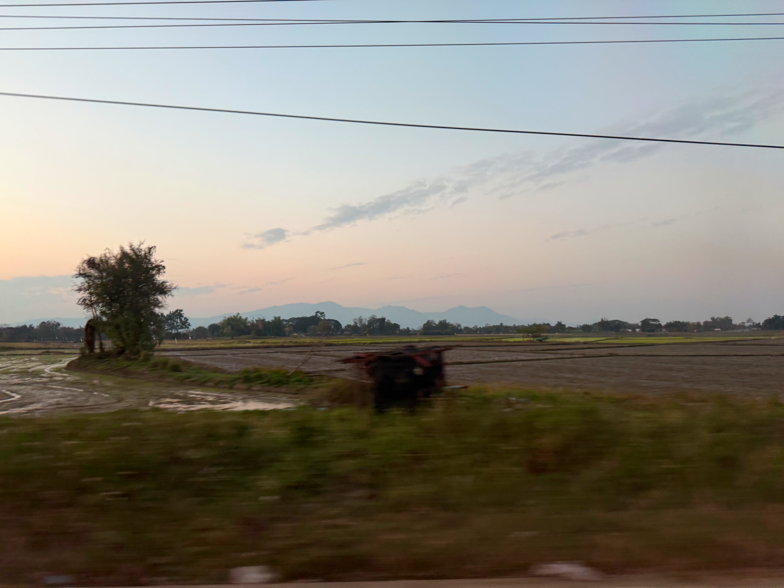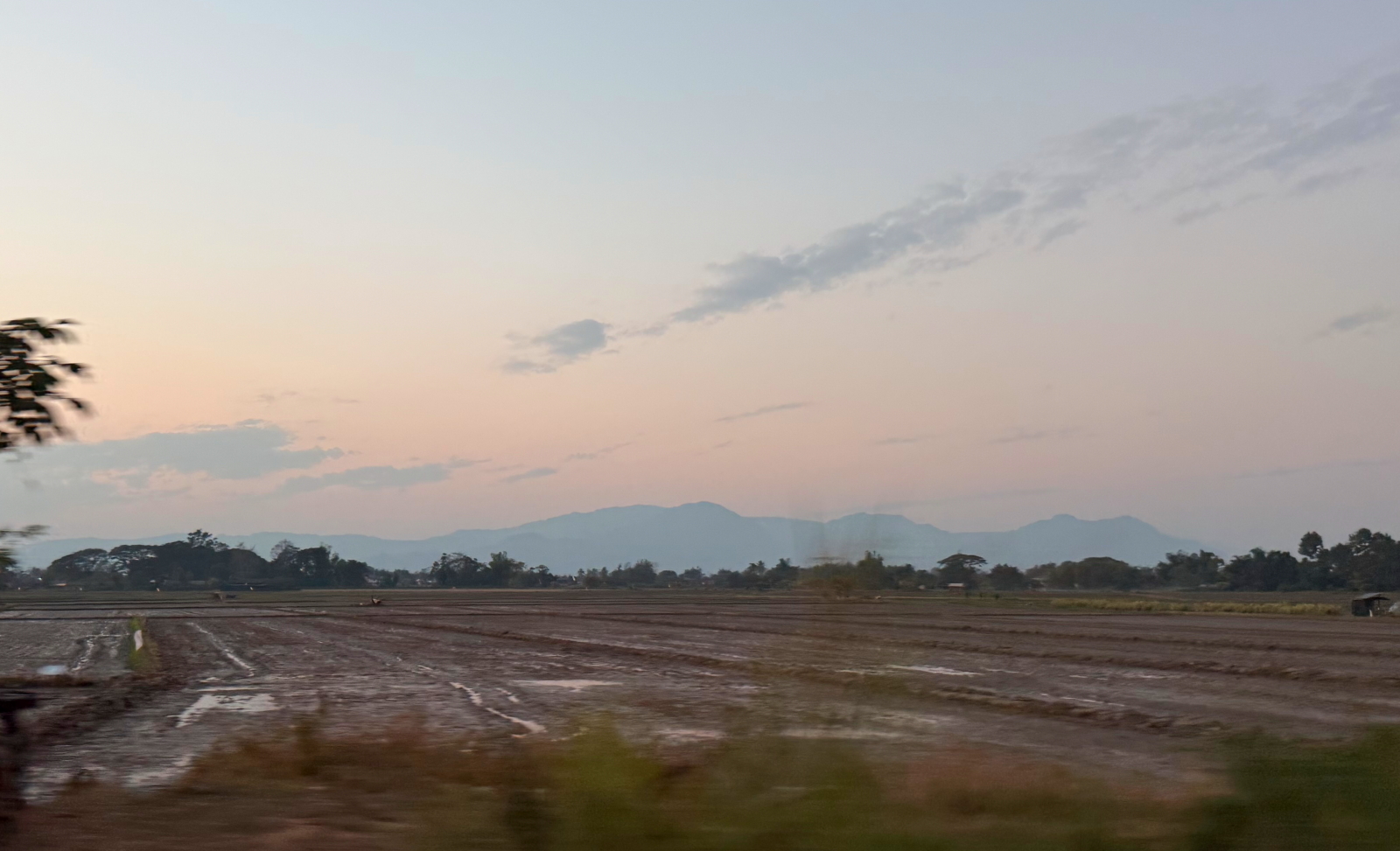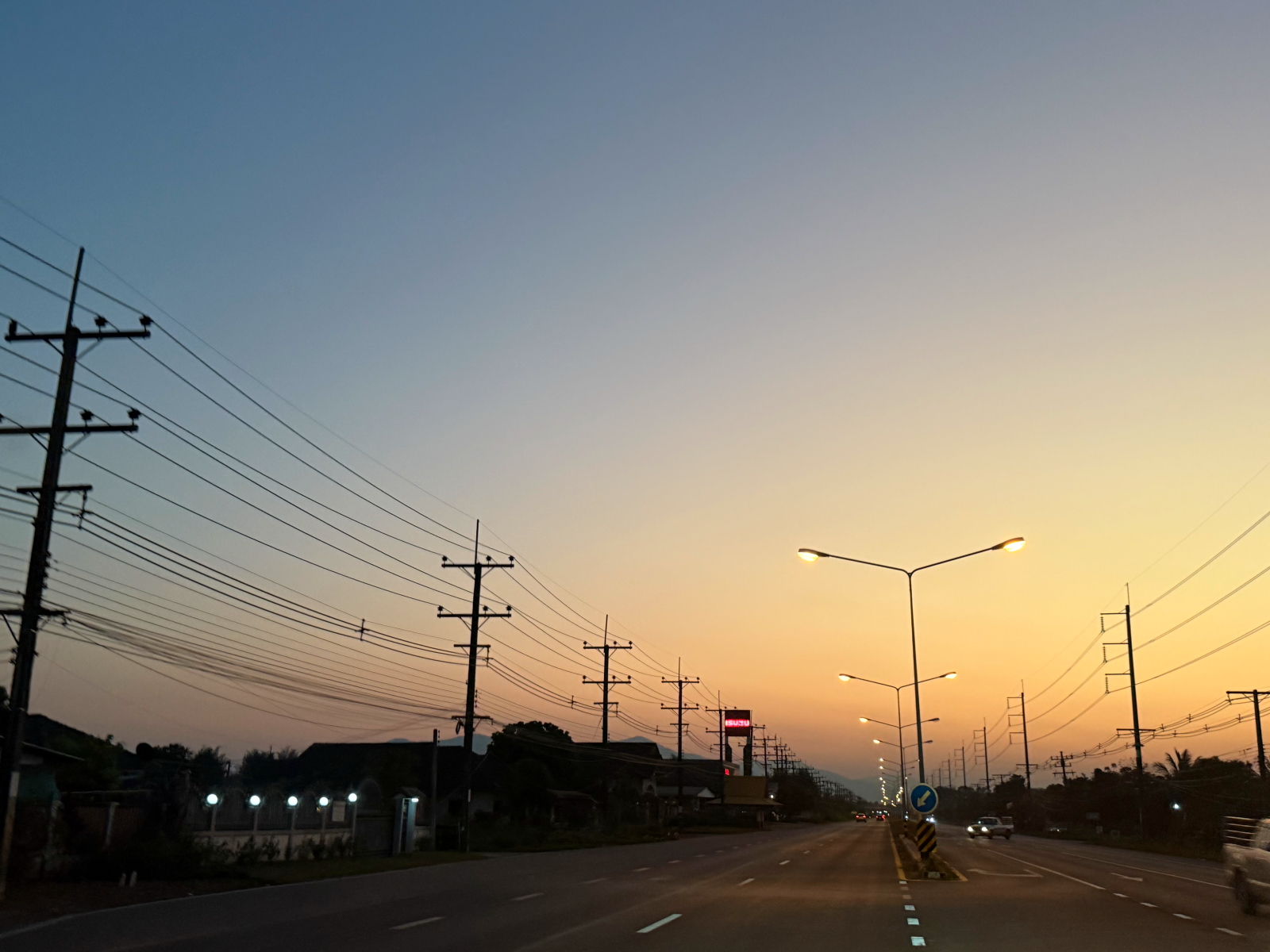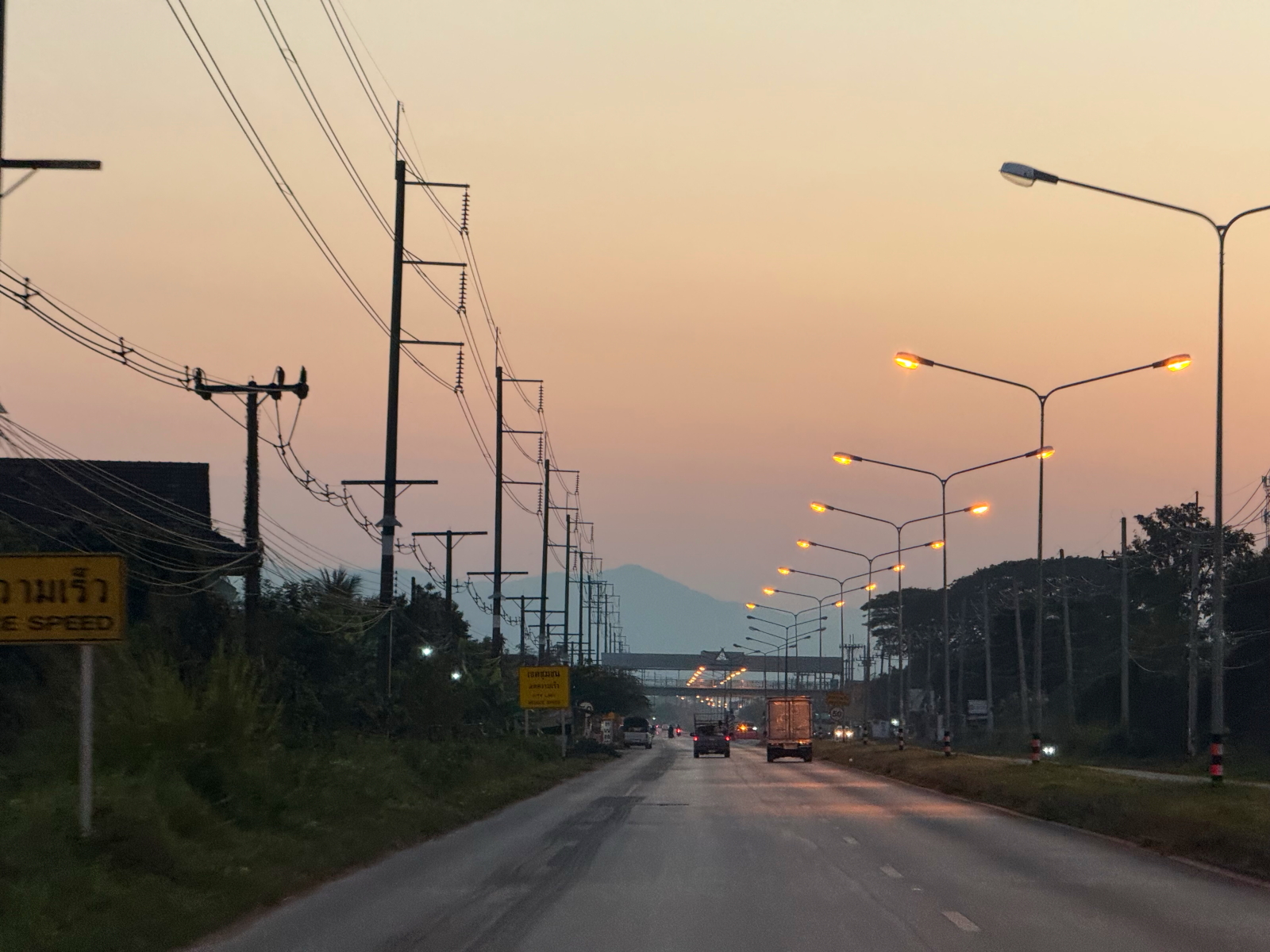 Uターンして南下すると、メーチャン市街の山々がオレンジバックに綺麗なシルエットです