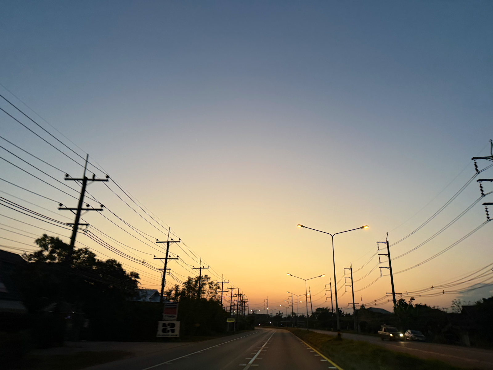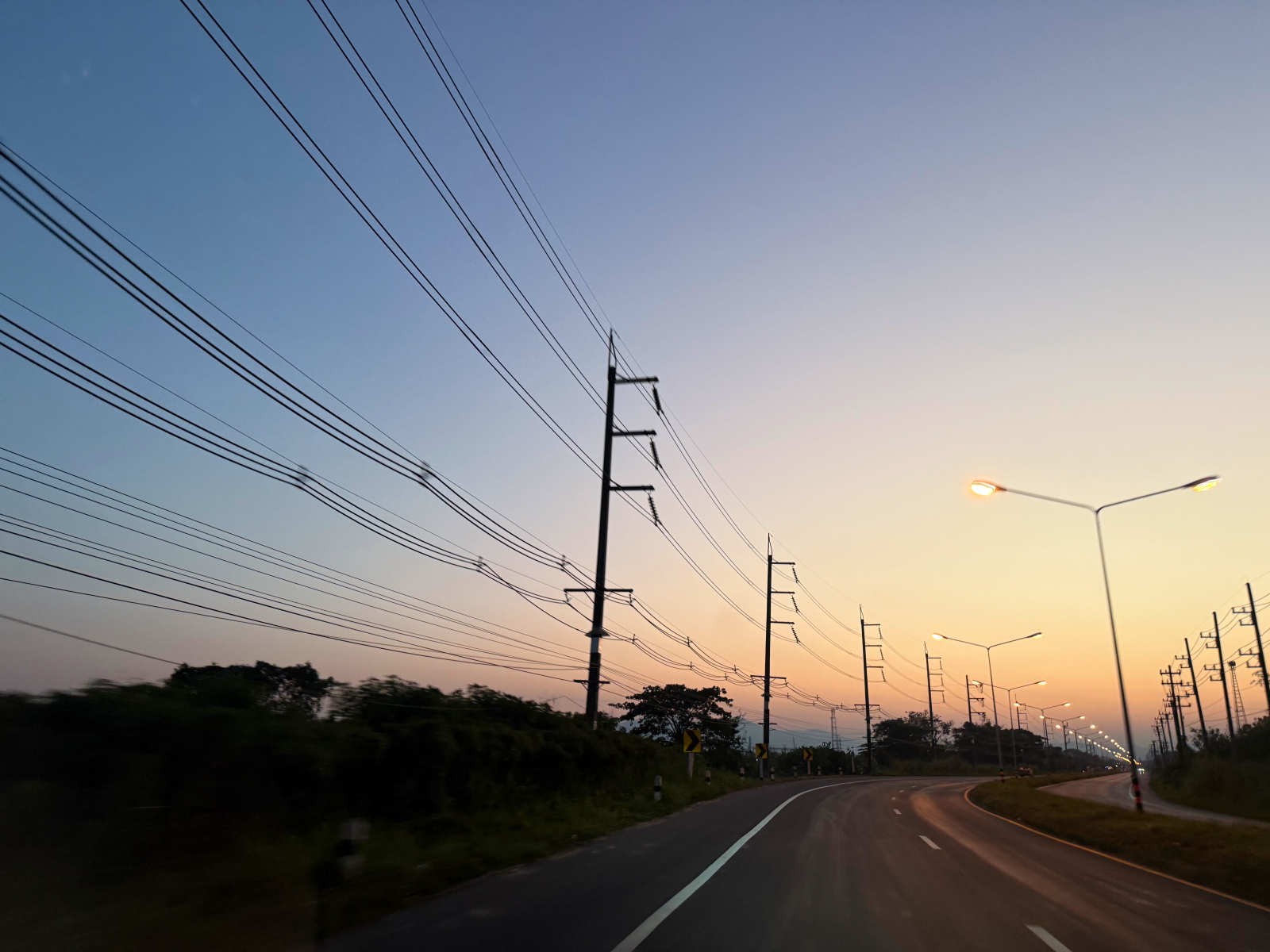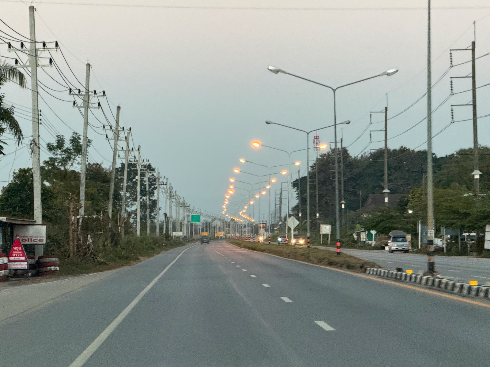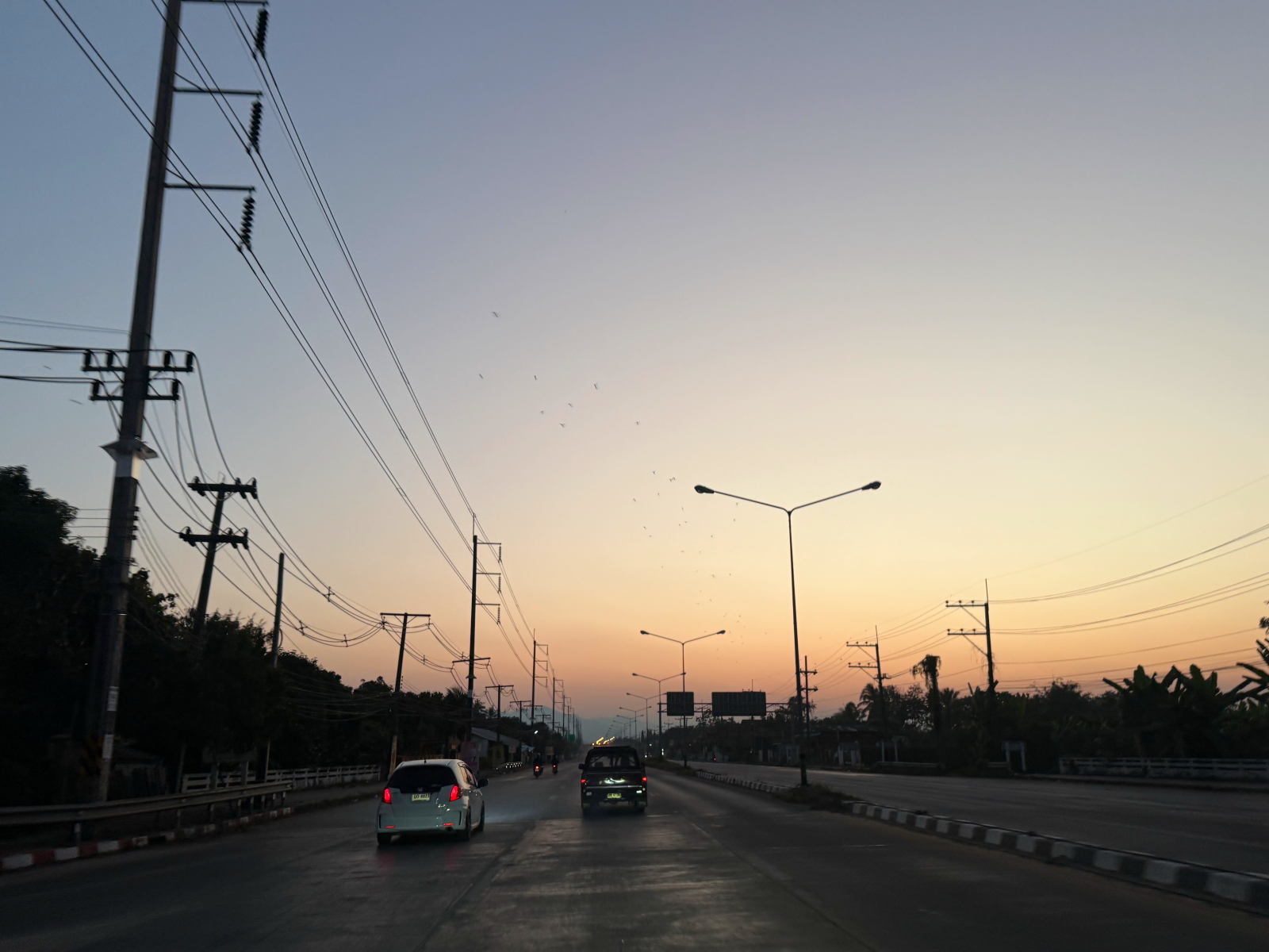 Uターンして南下すると、メーチャン市街の山々がオレンジバックに綺麗なシルエットです