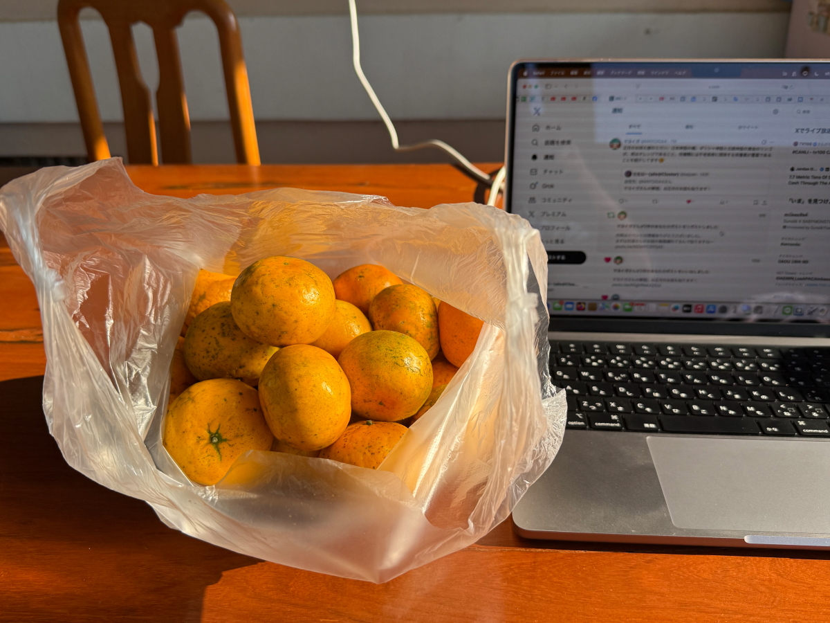 メタバース内の話題でミカンが体に良いとのことで、たくさん食べてます