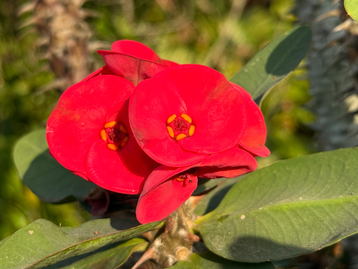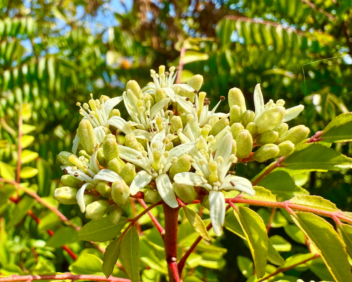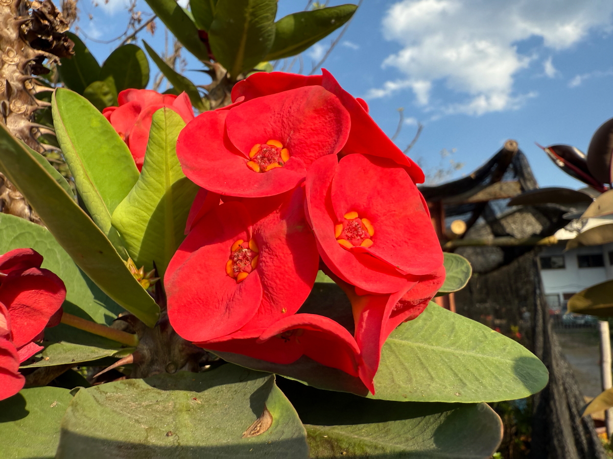 お花に夕陽がさして、青空バックにニッコリ!