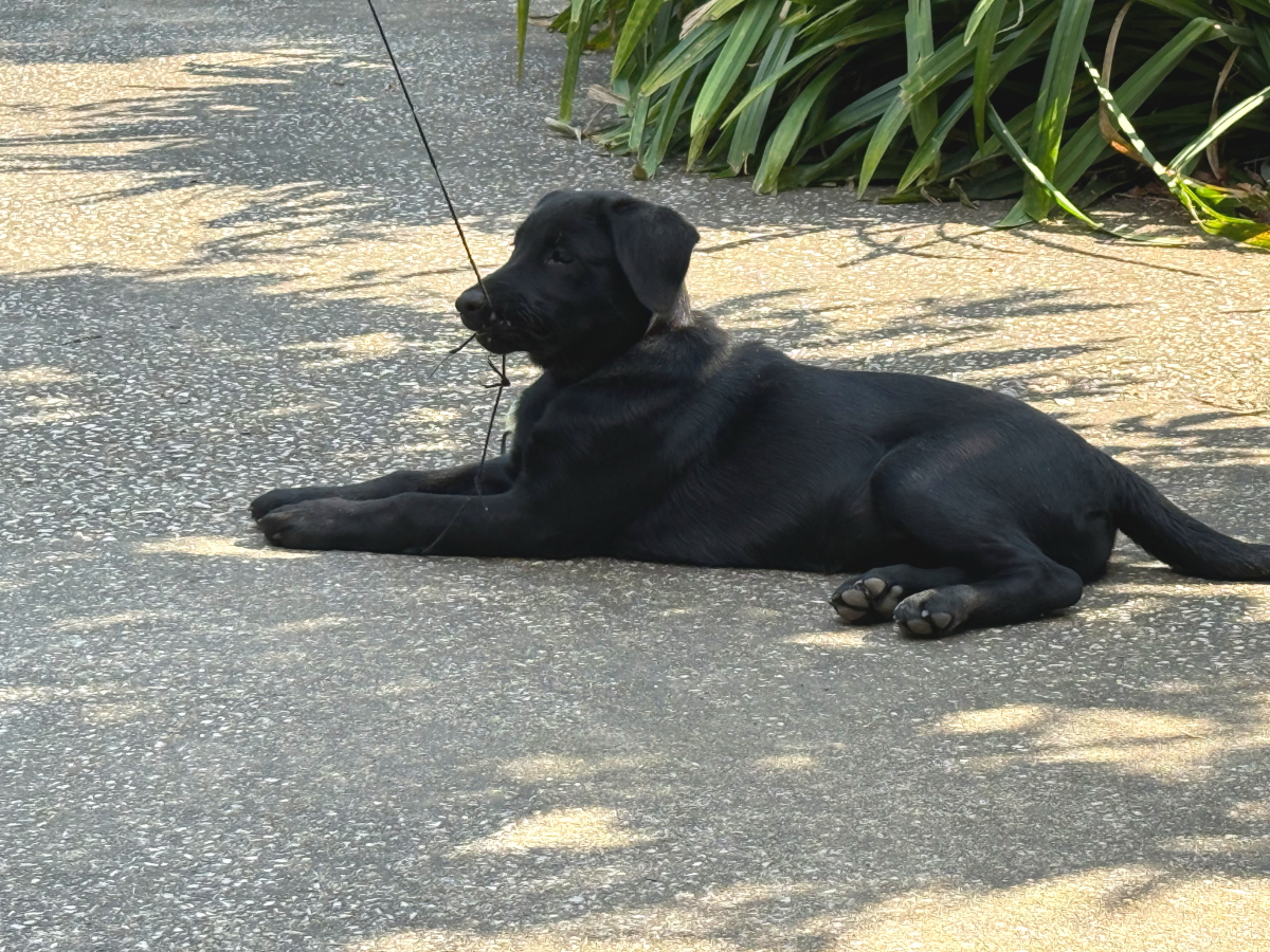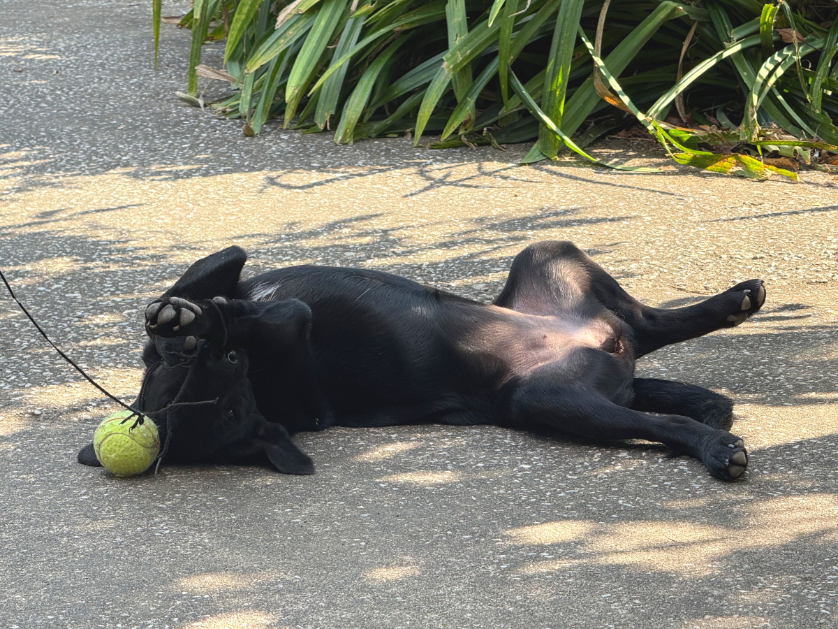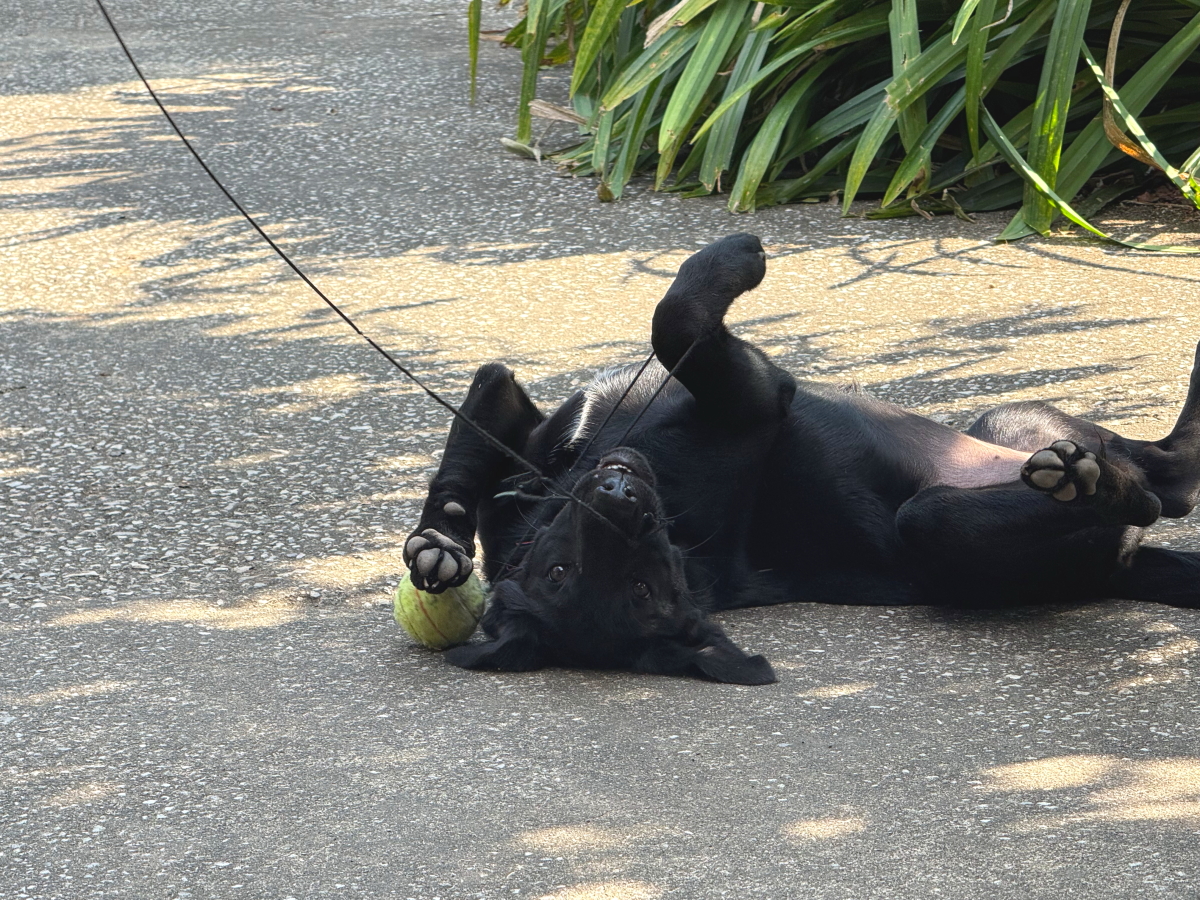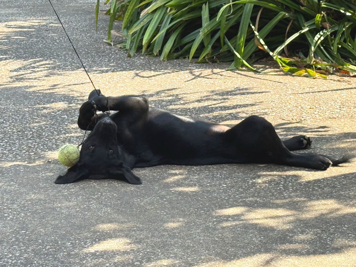 生後4ヶ月のわんこはゴム紐付きテニスボールにじゃれつき中〜