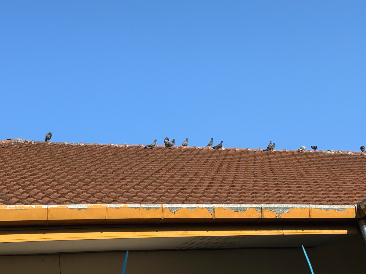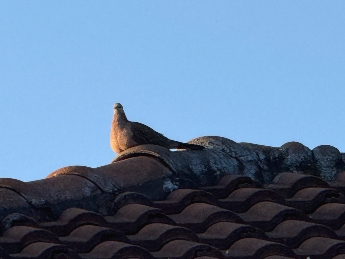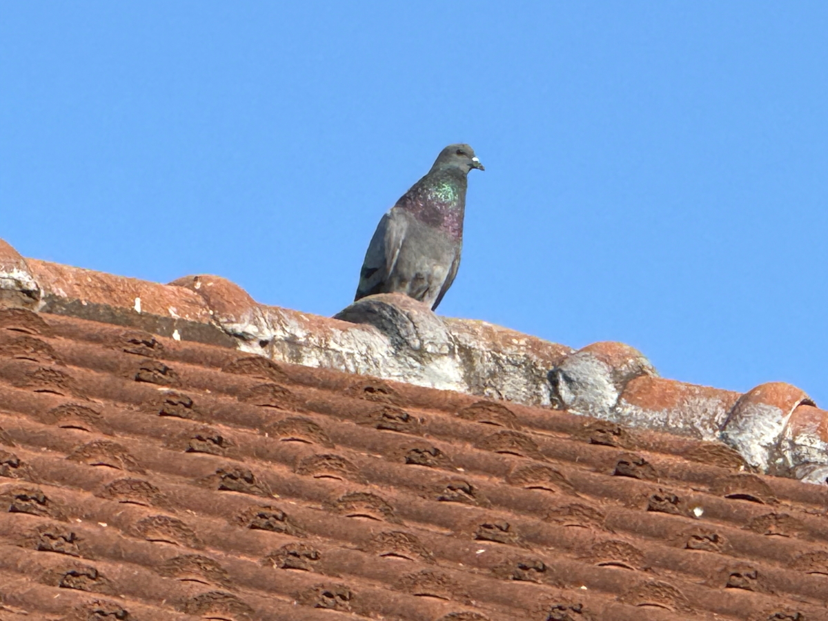 西陽の中でもこちらを見つめる、屋根上の鳥さん