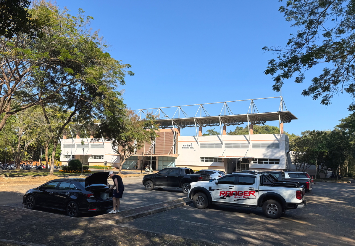 プール駐車場と管理棟、手前の白人さんはプールではなくテニスコートに向かいました