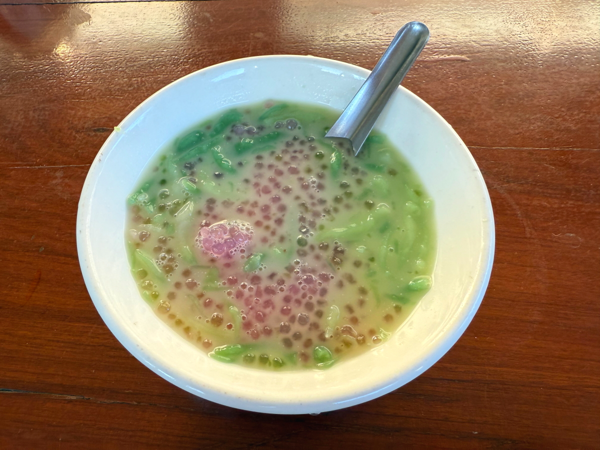 先ほどの市場で買った寒天のデザート、甘い汁に色とりどりの寒天が浮かびます