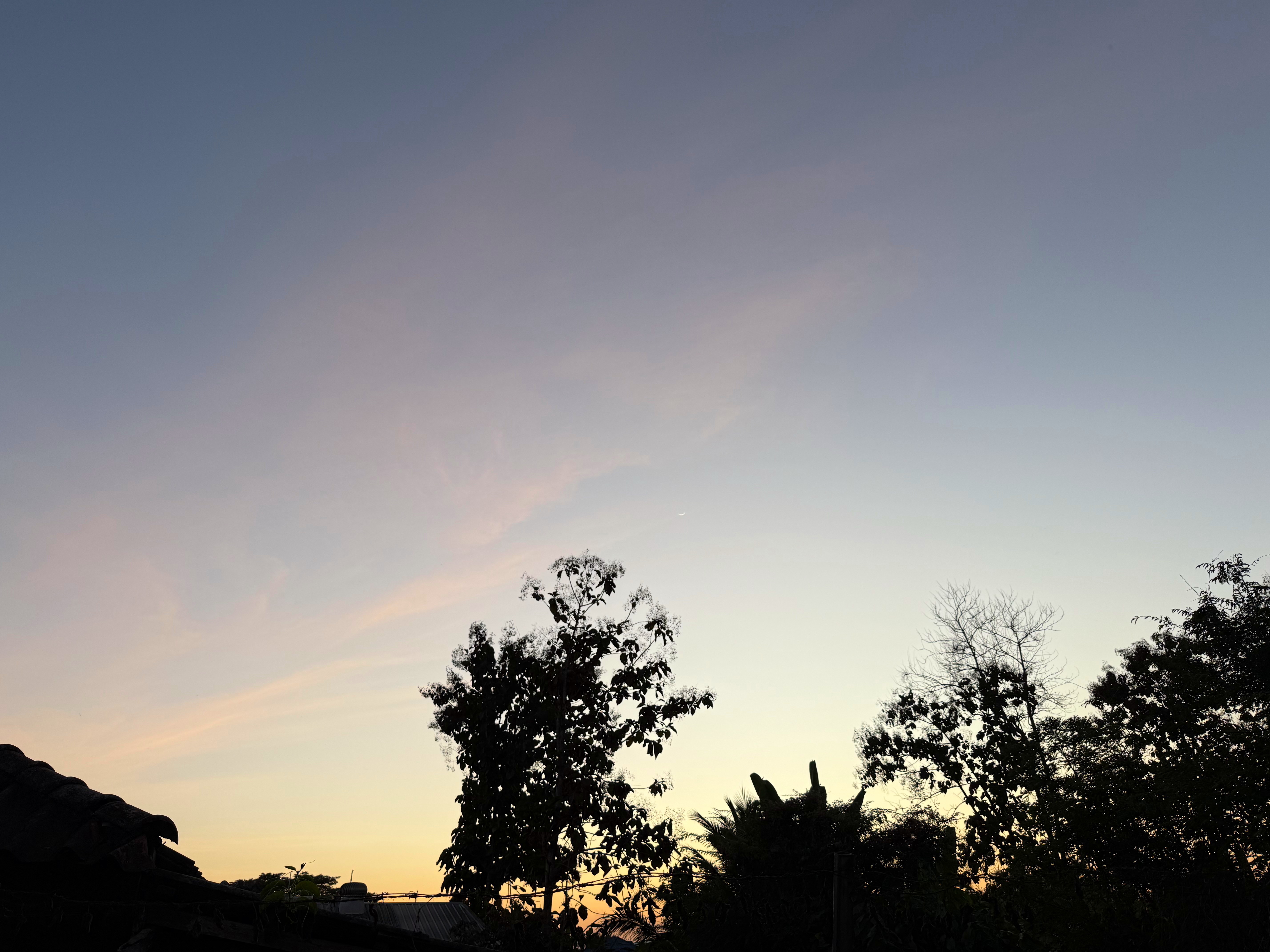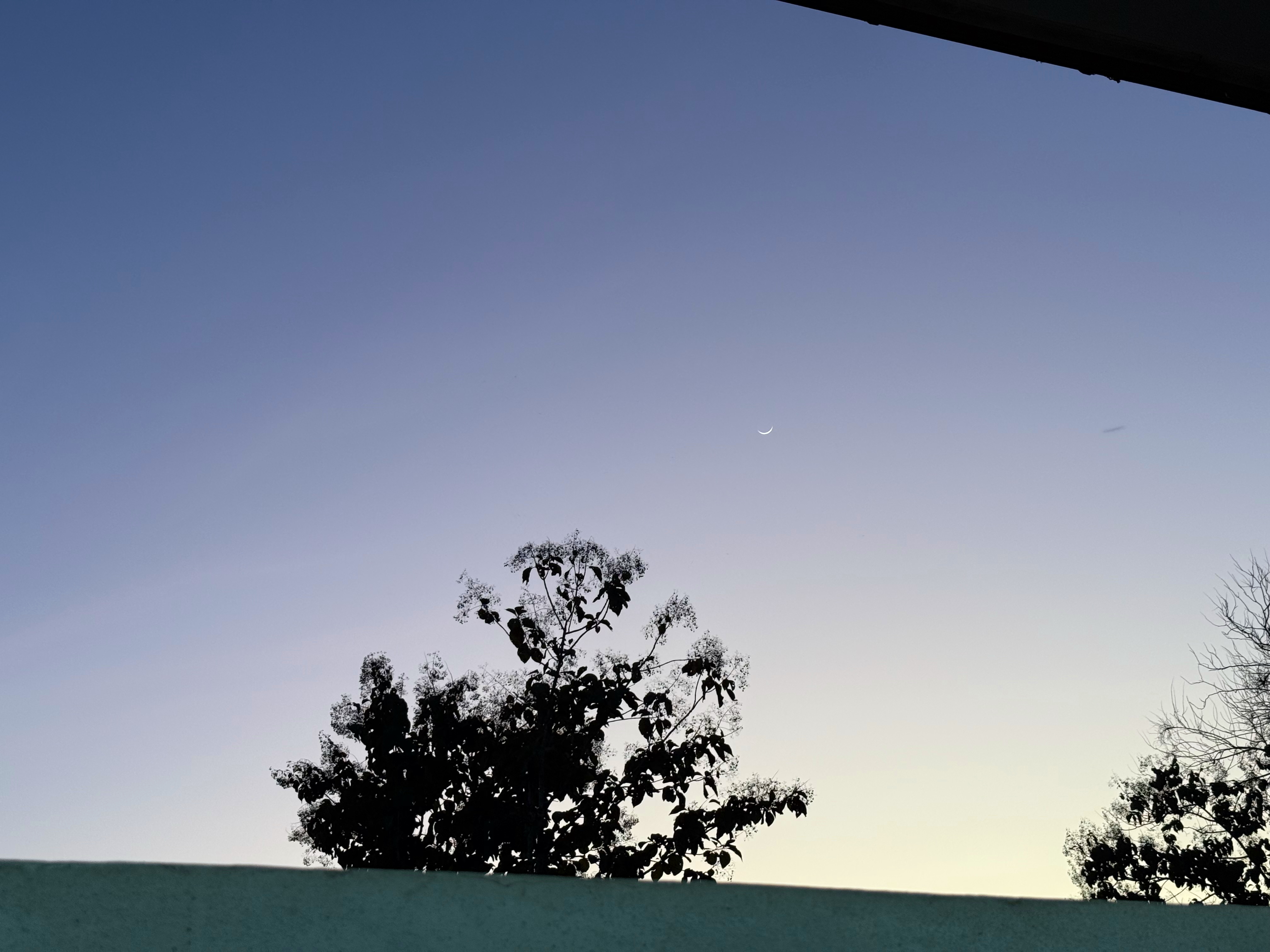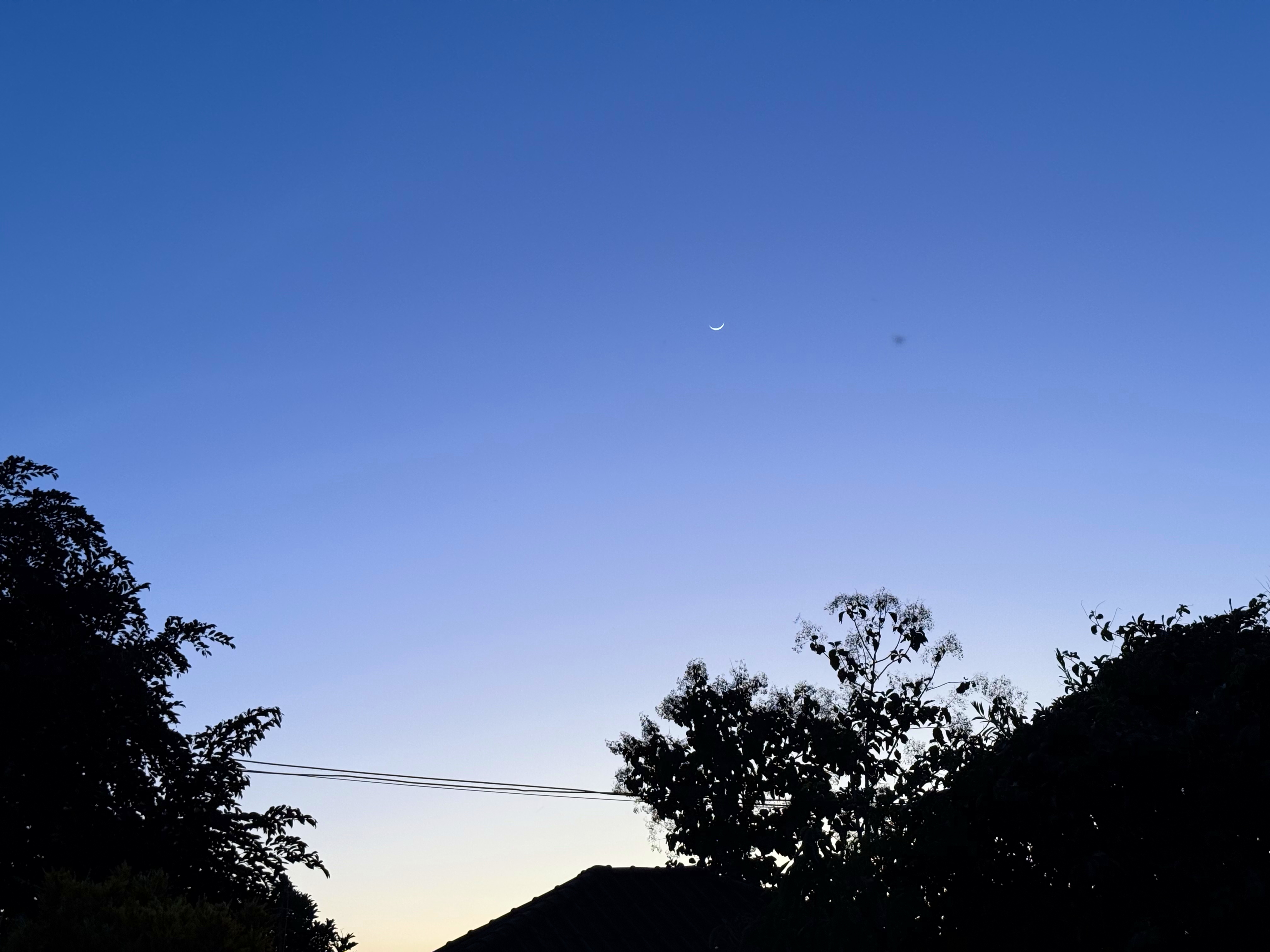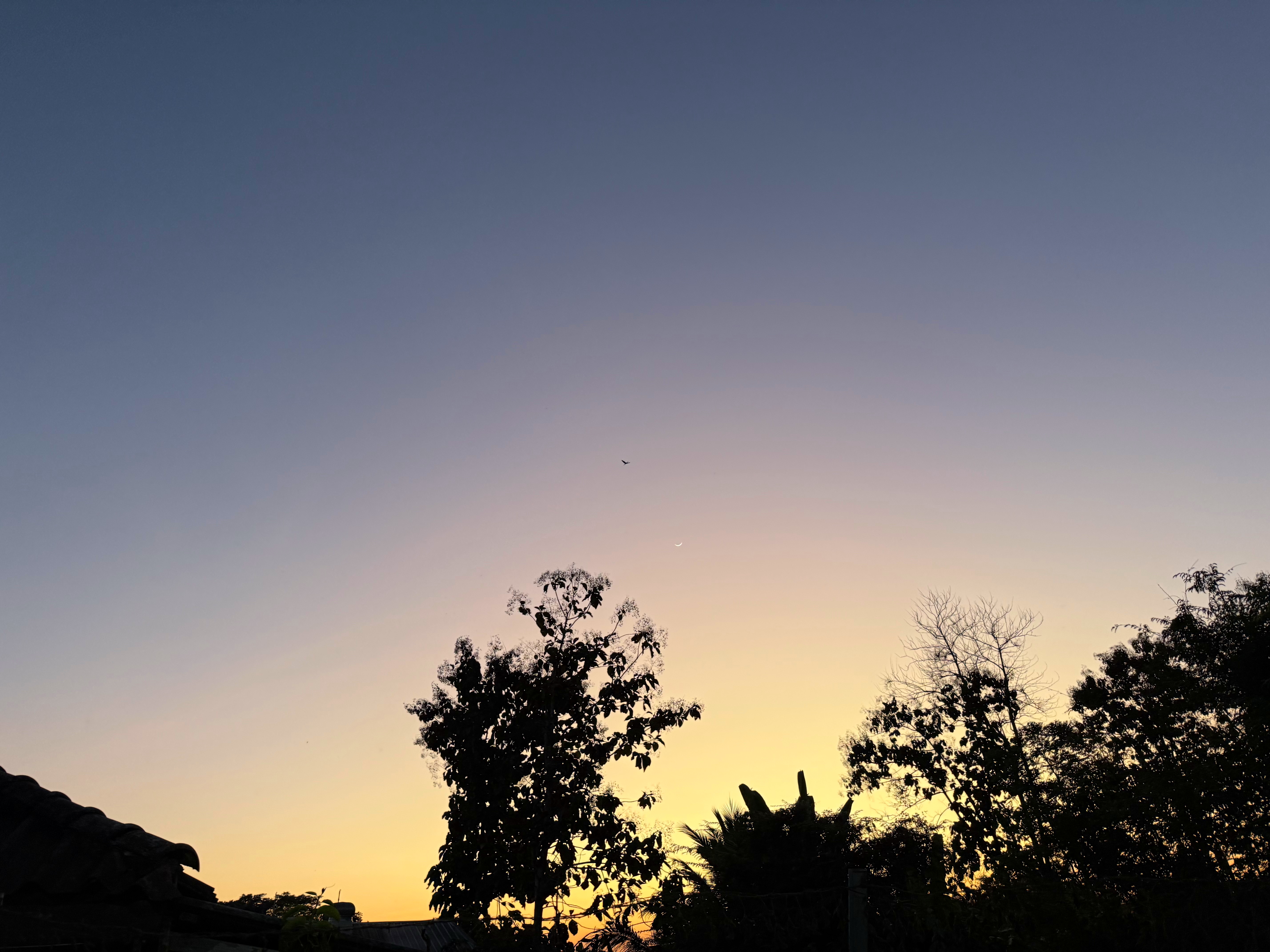 鳥さんは飛んで行きましたが、木の右上に細い月が浮かびました