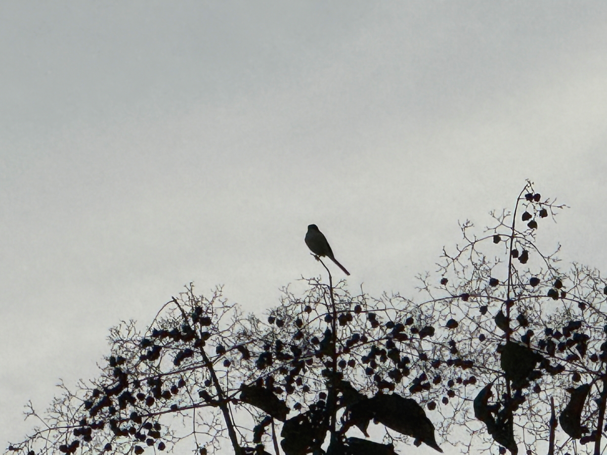 空が色づき始めましたが、木のてっぺんには先ほどの鳥さん