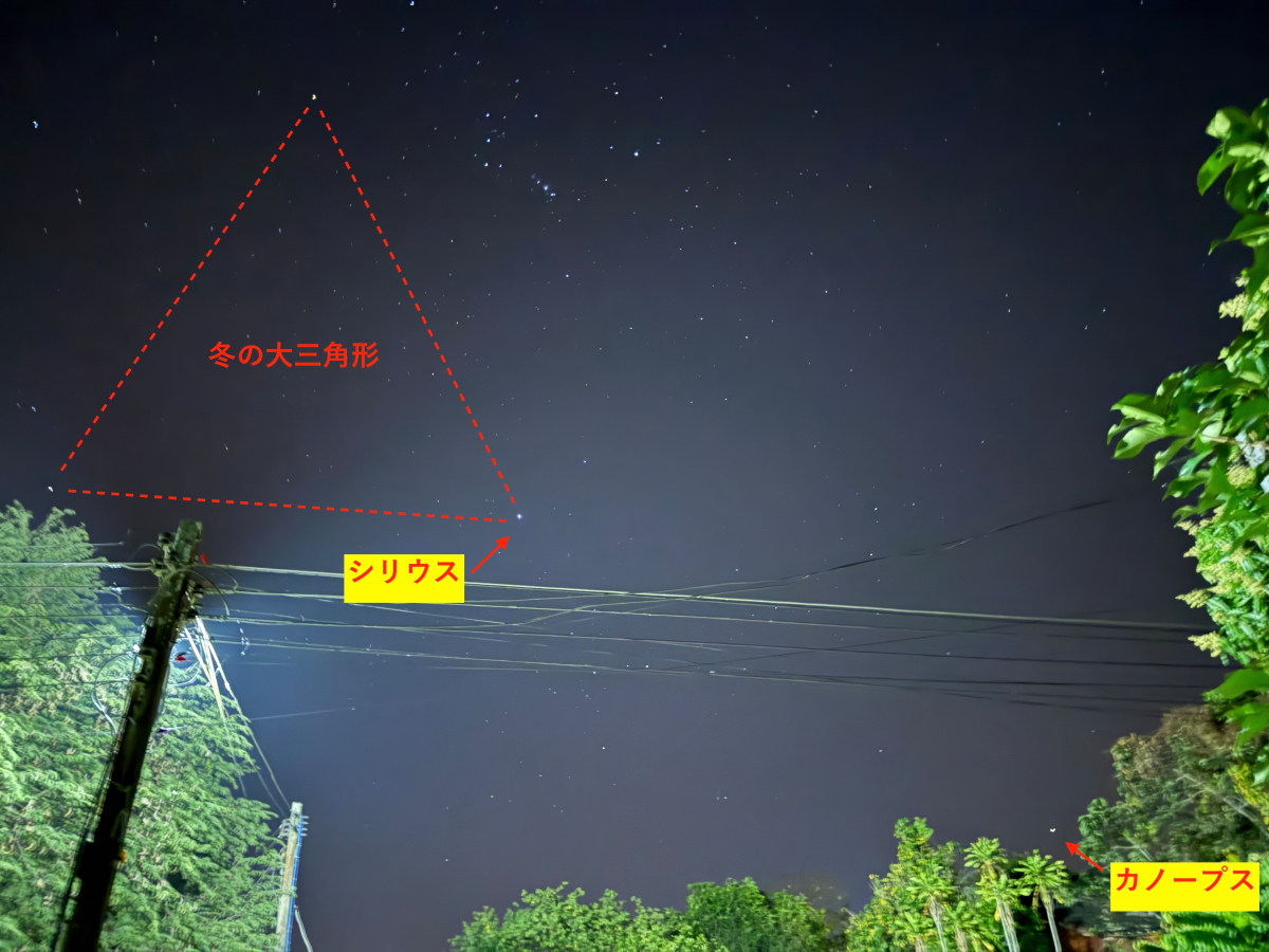 この日も夜空が綺麗で冬の大三角形の下に、日本ではなかなか見えないカノープスが見えました