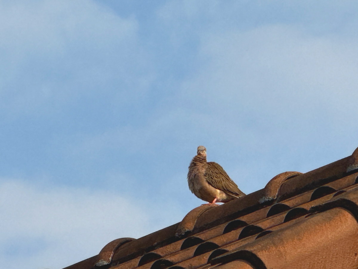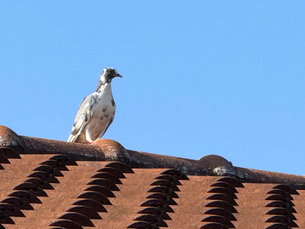 屋根上のヒナは、まだ羽が生えそろっていないようで、マダラ模様でした