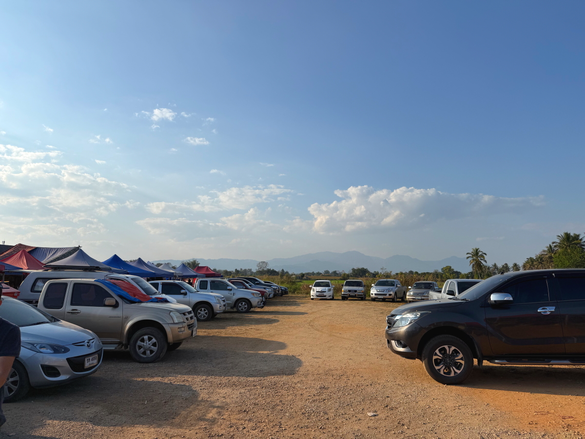 不定期開催市場の道路では、どこも赤色回転灯が大活躍