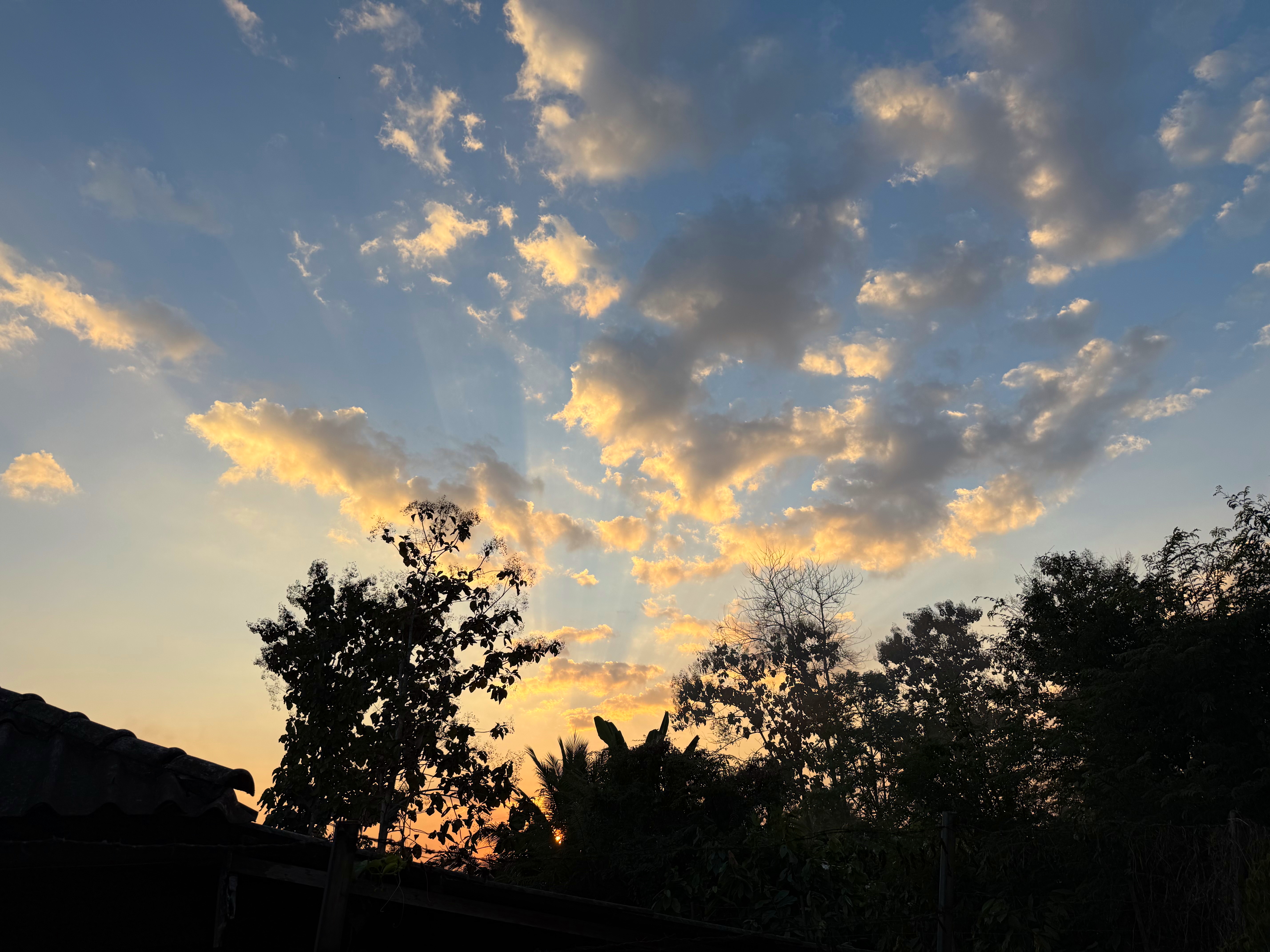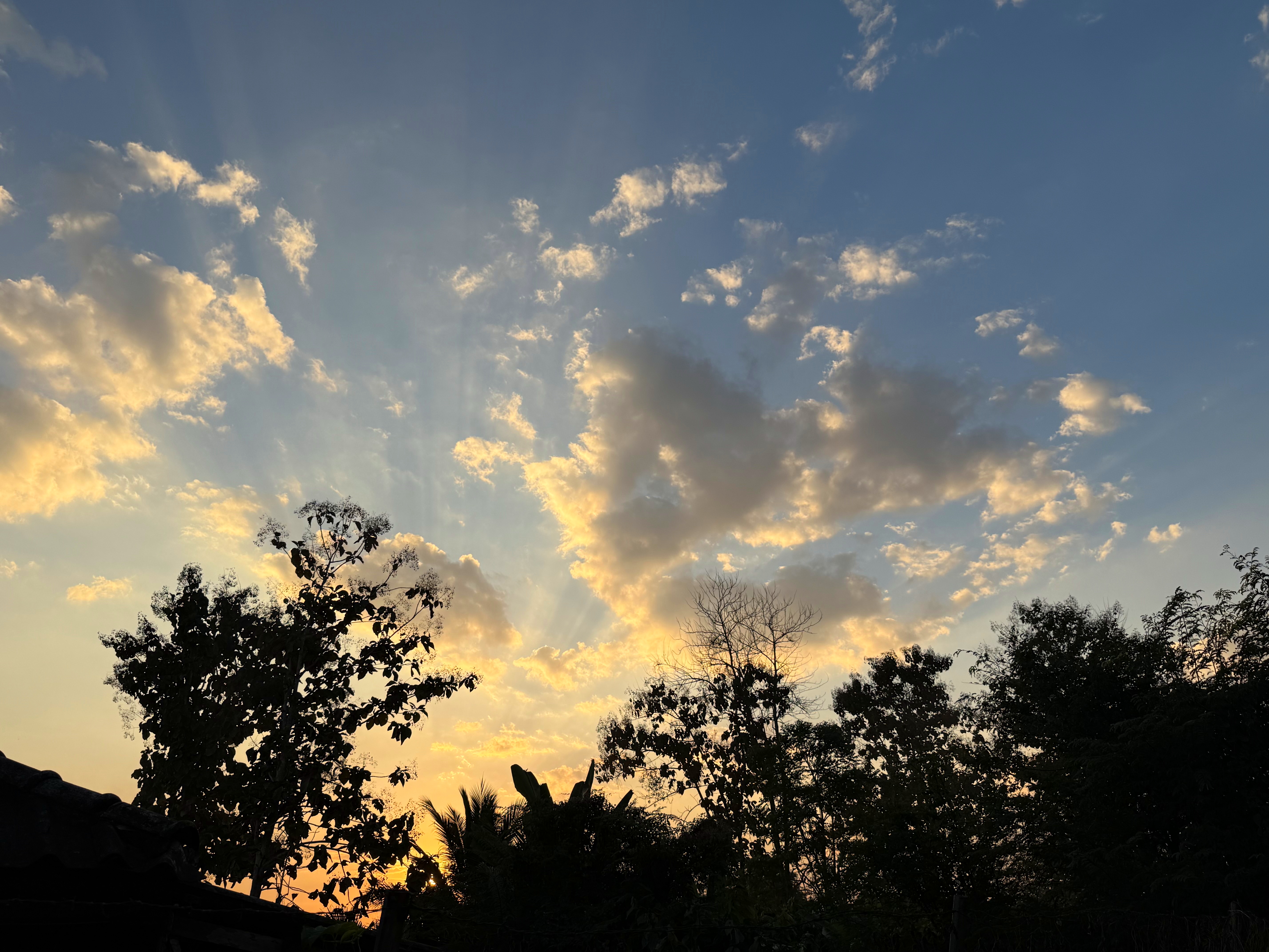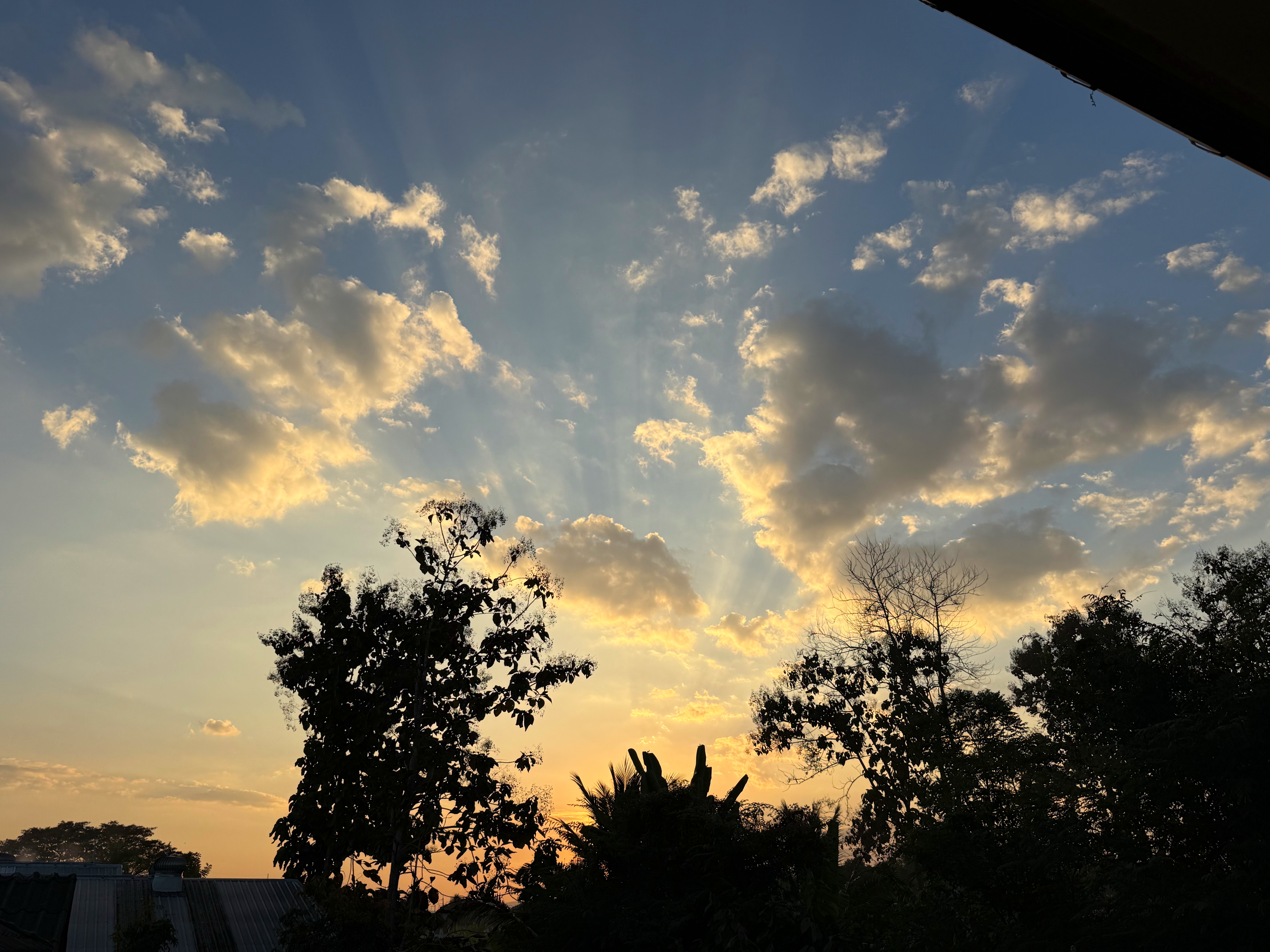駐車場の西の空、太陽からの光で雲の影がお空に伸びてました